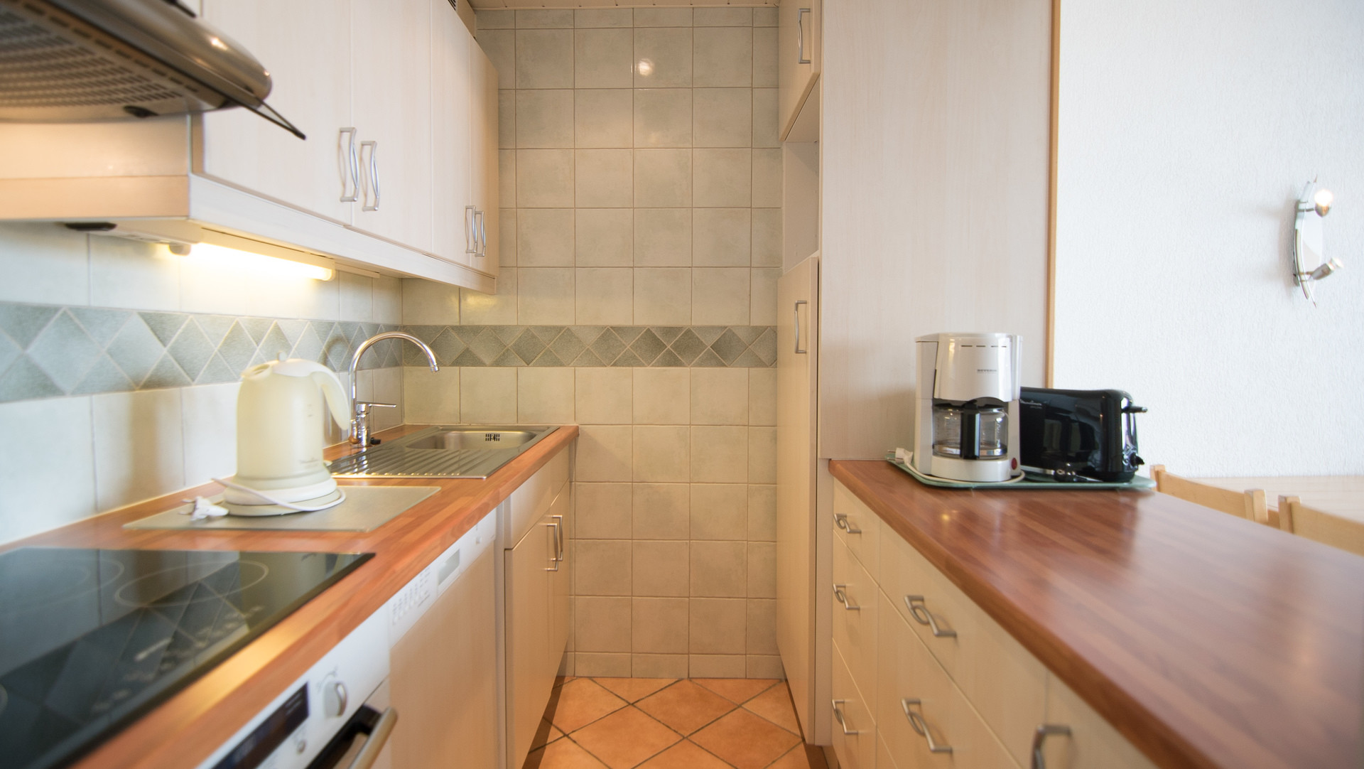 Cuisine : plaques vitrocéramiques, four, réfrigérateur,lave-vaisselle, micro-ondes et cafetière à filtre.
