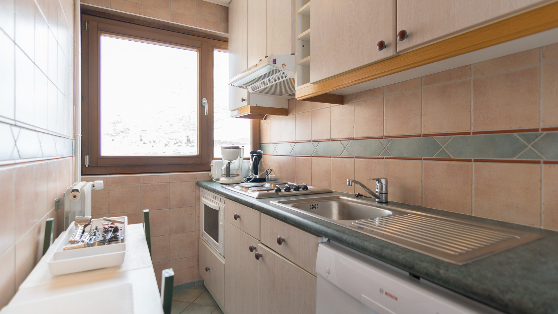 Cuisine : plaques vitroceramiques, four, micro-onde, cafetiere a filtre, refrigerateur et lave-vaisselle.