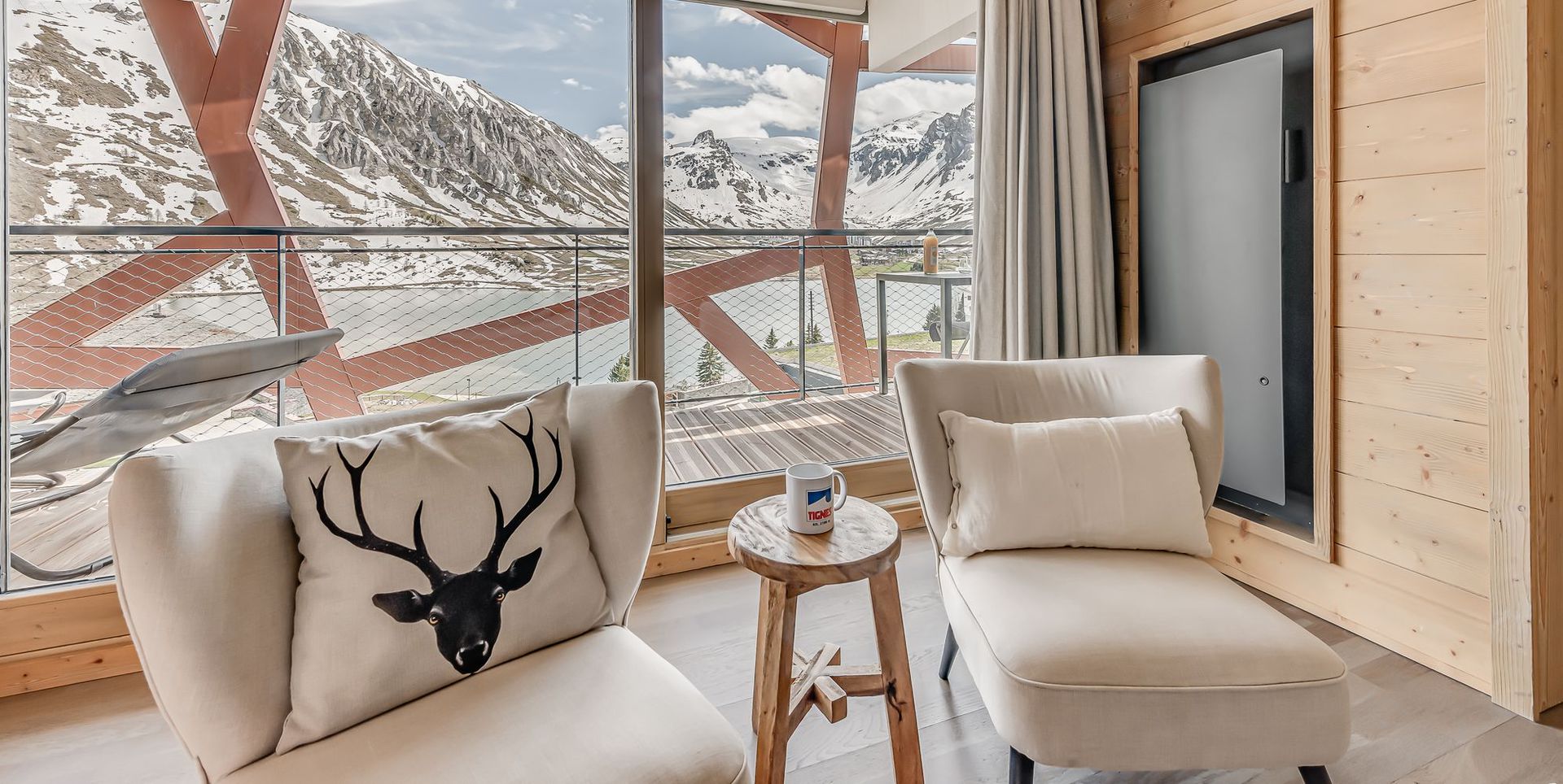 Il possede un balcon expose plein sud, avec vues exceptionnelles et degagees sur le lac naturel de Tignes, les massifs de Toviere et le glacier de la Grande Motte