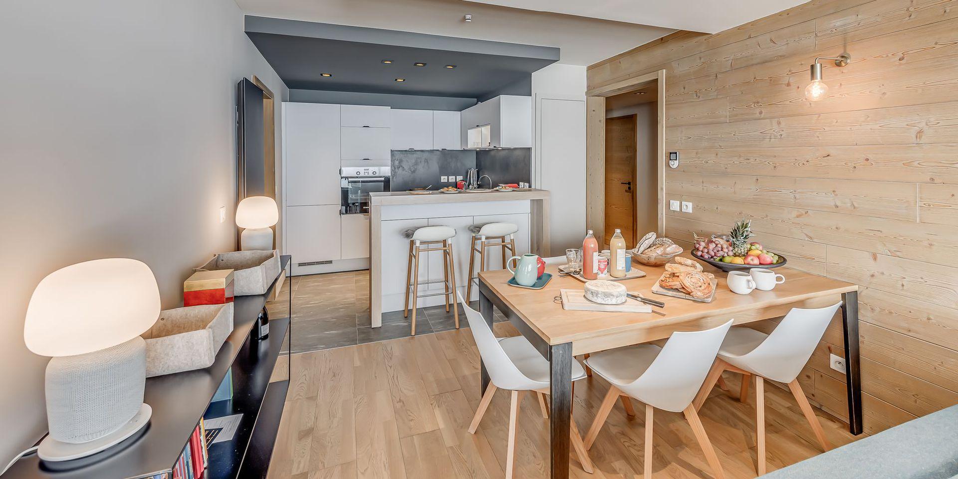 * Une cuisine entierement equipee : four - four micro-ondes - refrigerateur - congelateur - plaques a induction - hotte aspirante - bouilloire - lave-vaisselle - cafetiere - grille-pain - lave-linge - appareil a raclette - service a fondue