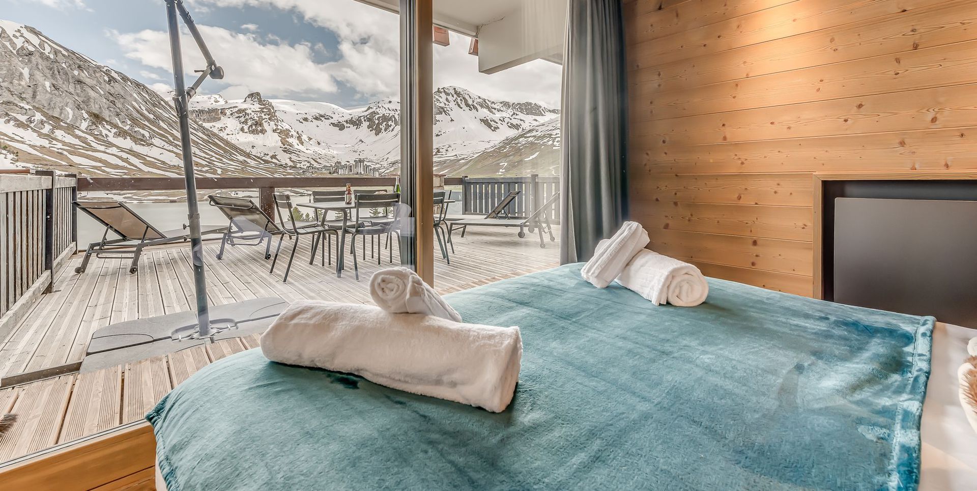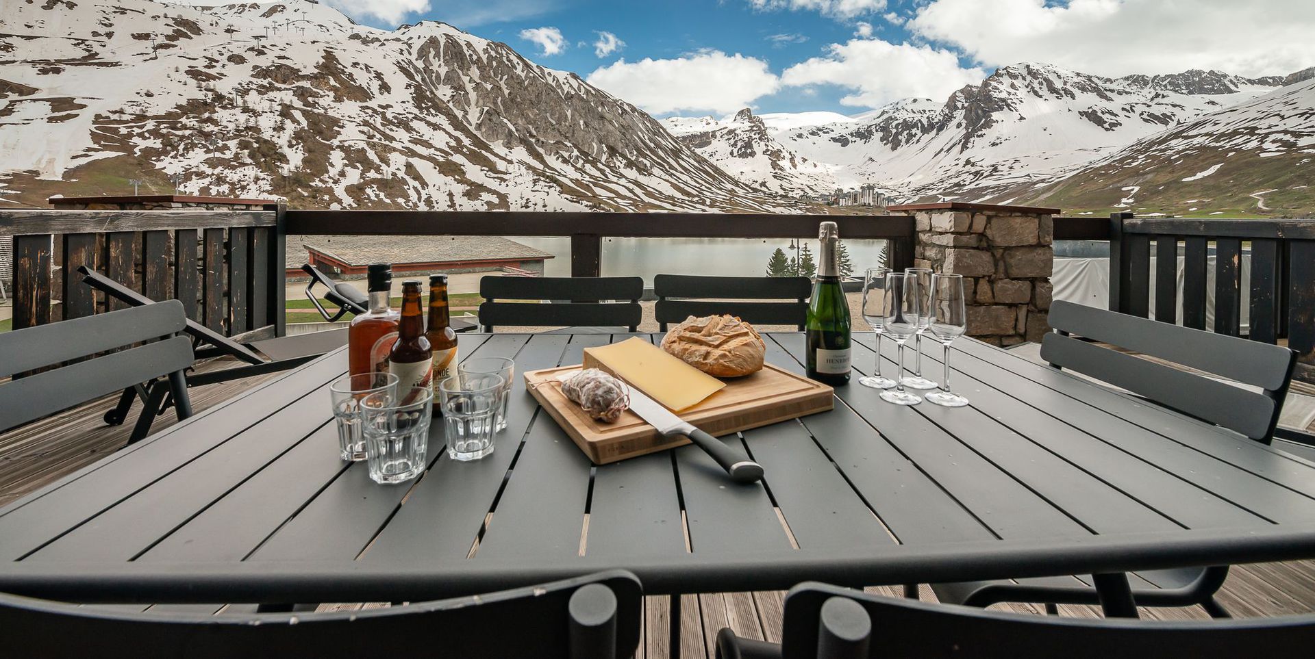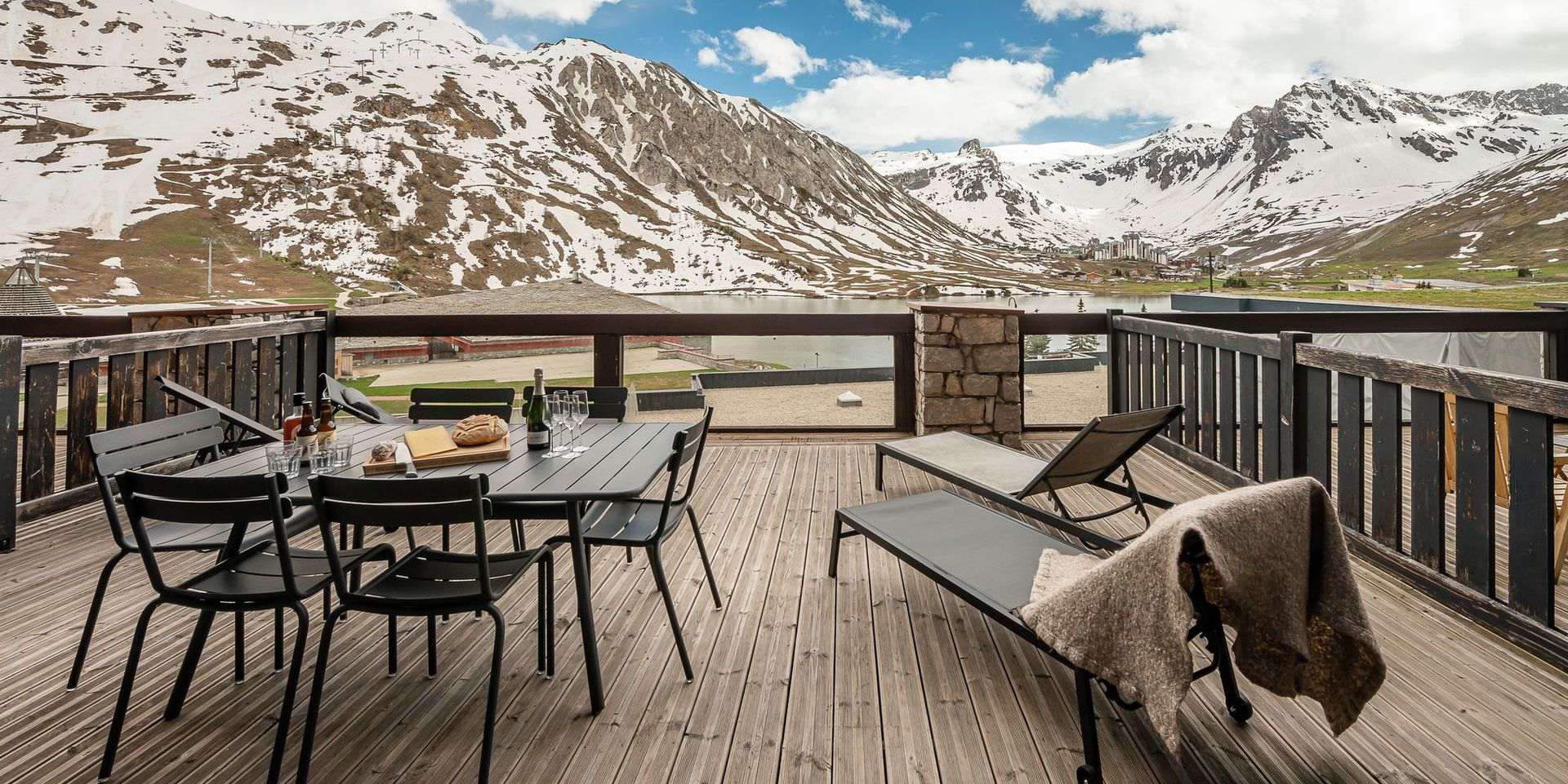 Il possede une terrasse de 35m2 exposee plein sud, avec vues exceptionnelles et degagees sur le lac naturel de Tignes, les massifs de Toviere et le glacier de la Grande Motte