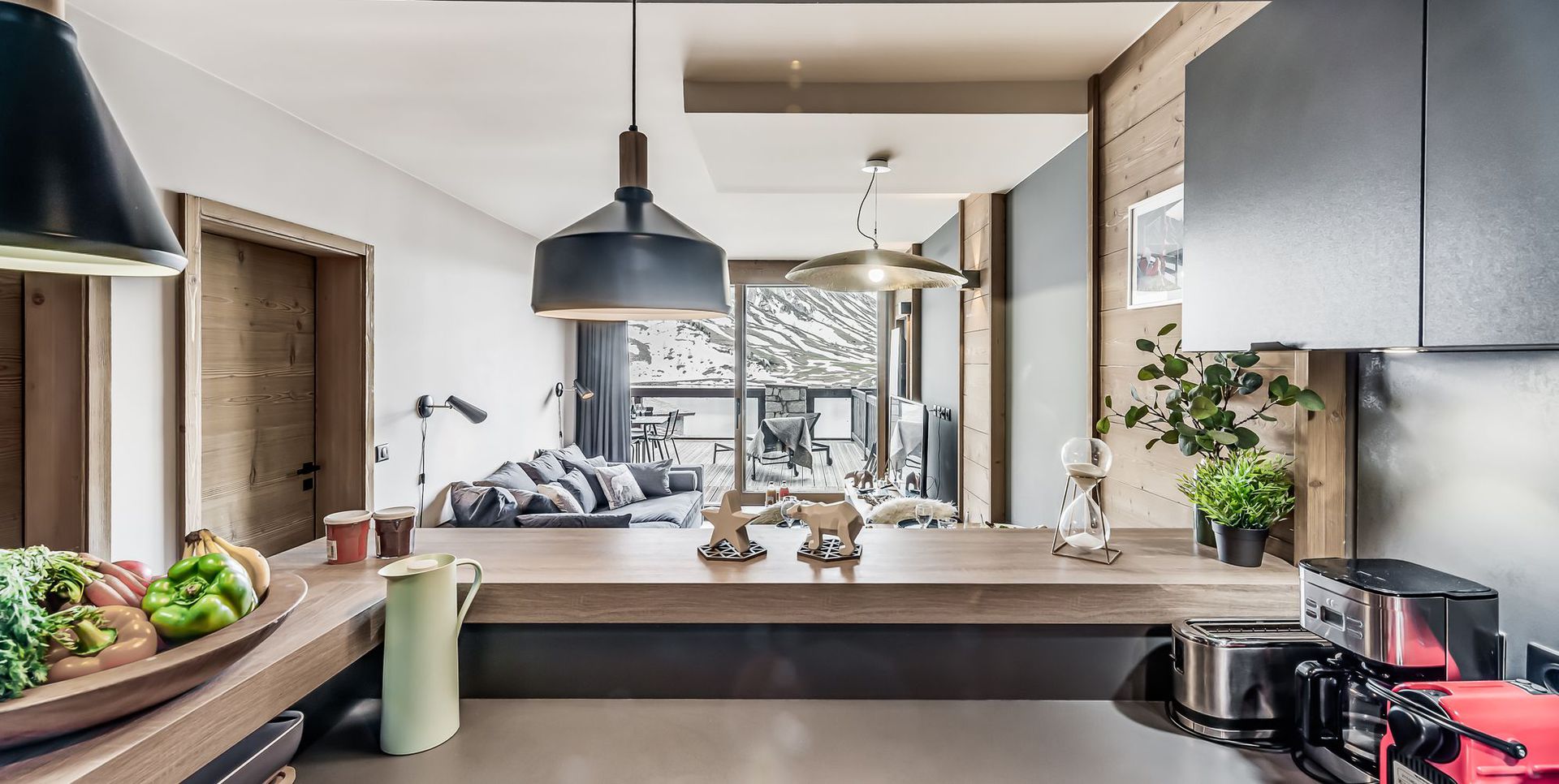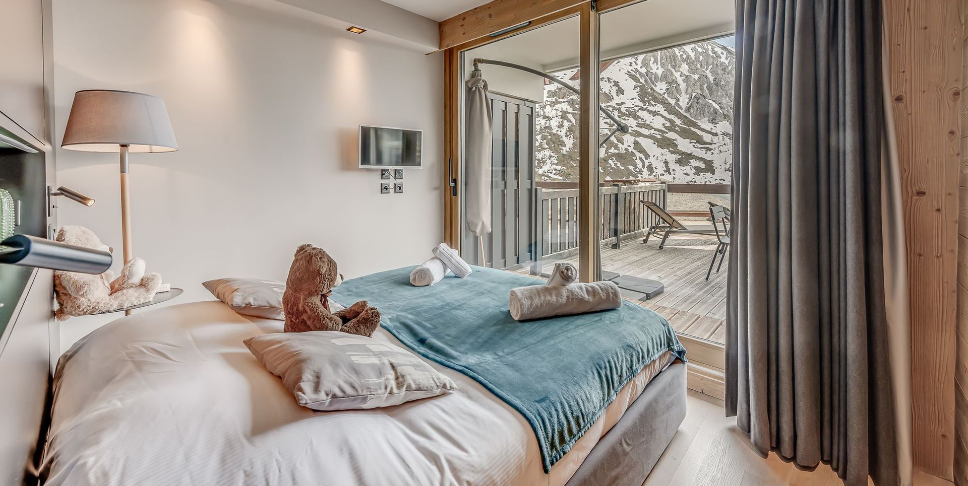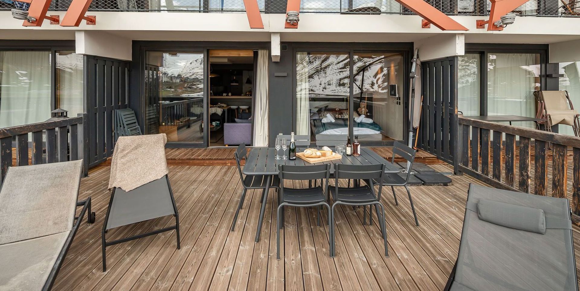 Il possede une terrasse de 35m2 exposee plein sud, avec vues exceptionnelles et degagees sur le lac naturel de Tignes, les massifs de Toviere et le glacier de la Grande Motte