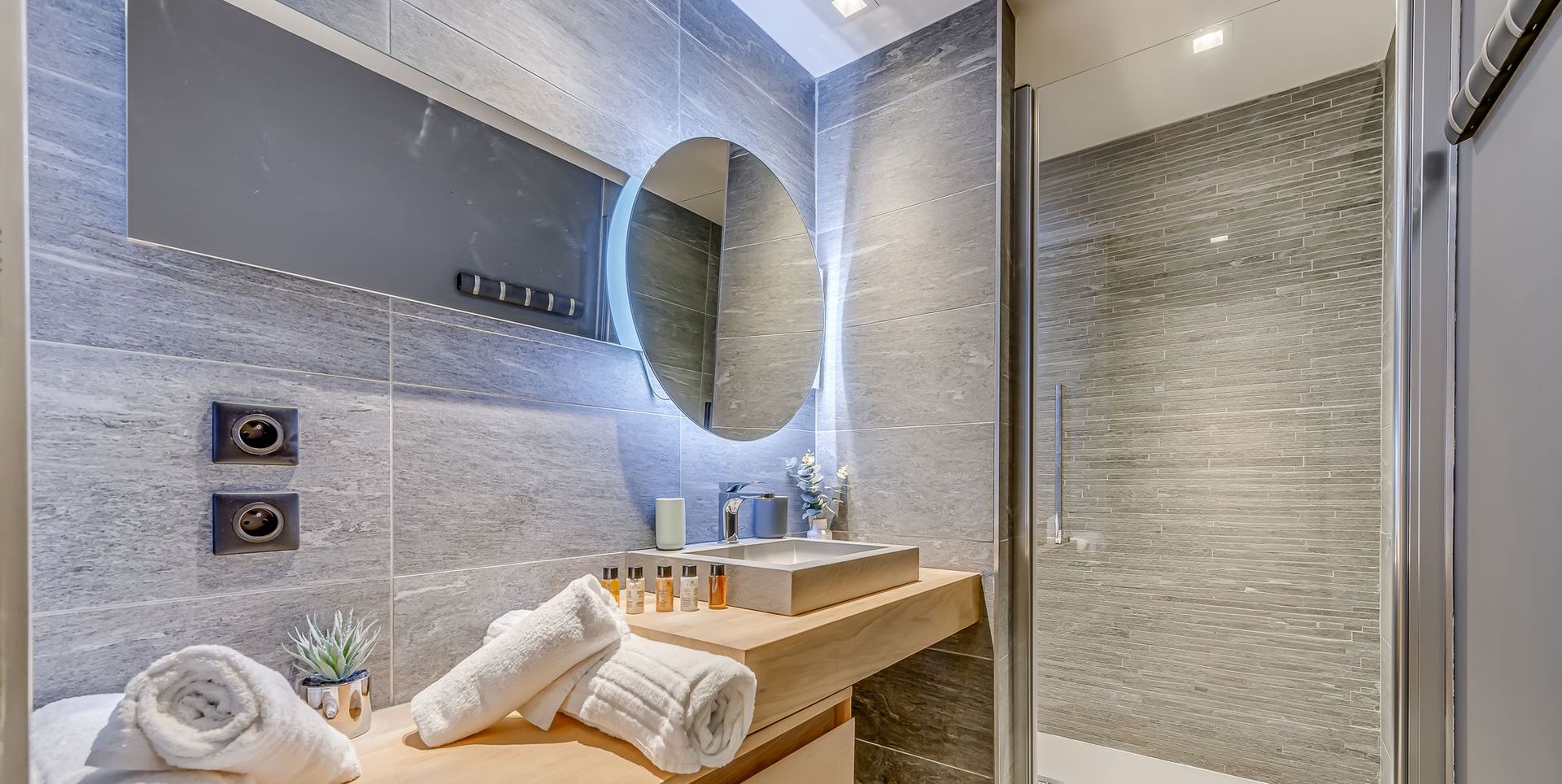 * Une salle de bain avec une douche a l'Italienne - une vasque