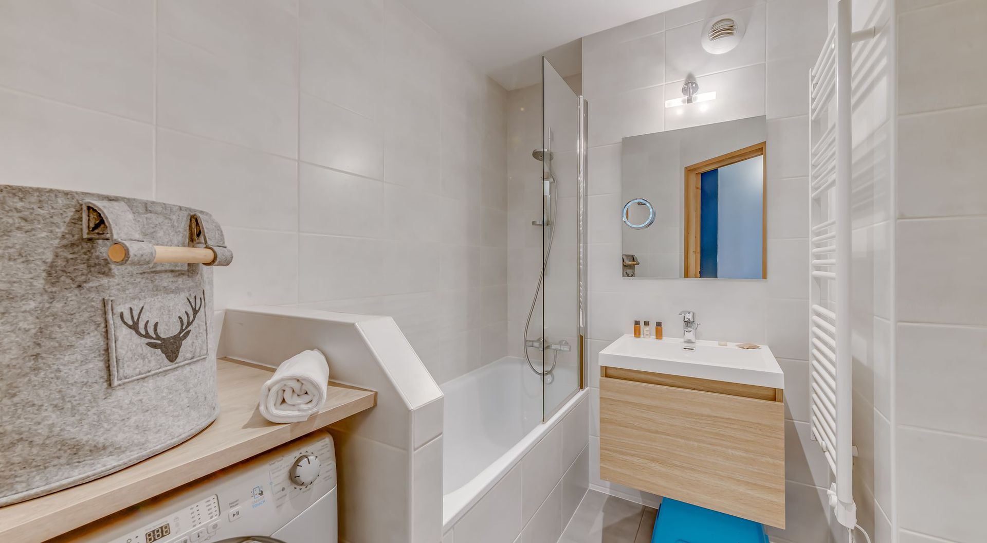 Salle de bain avec baignoire/douche, lavabo, WC, lave/seche-linge