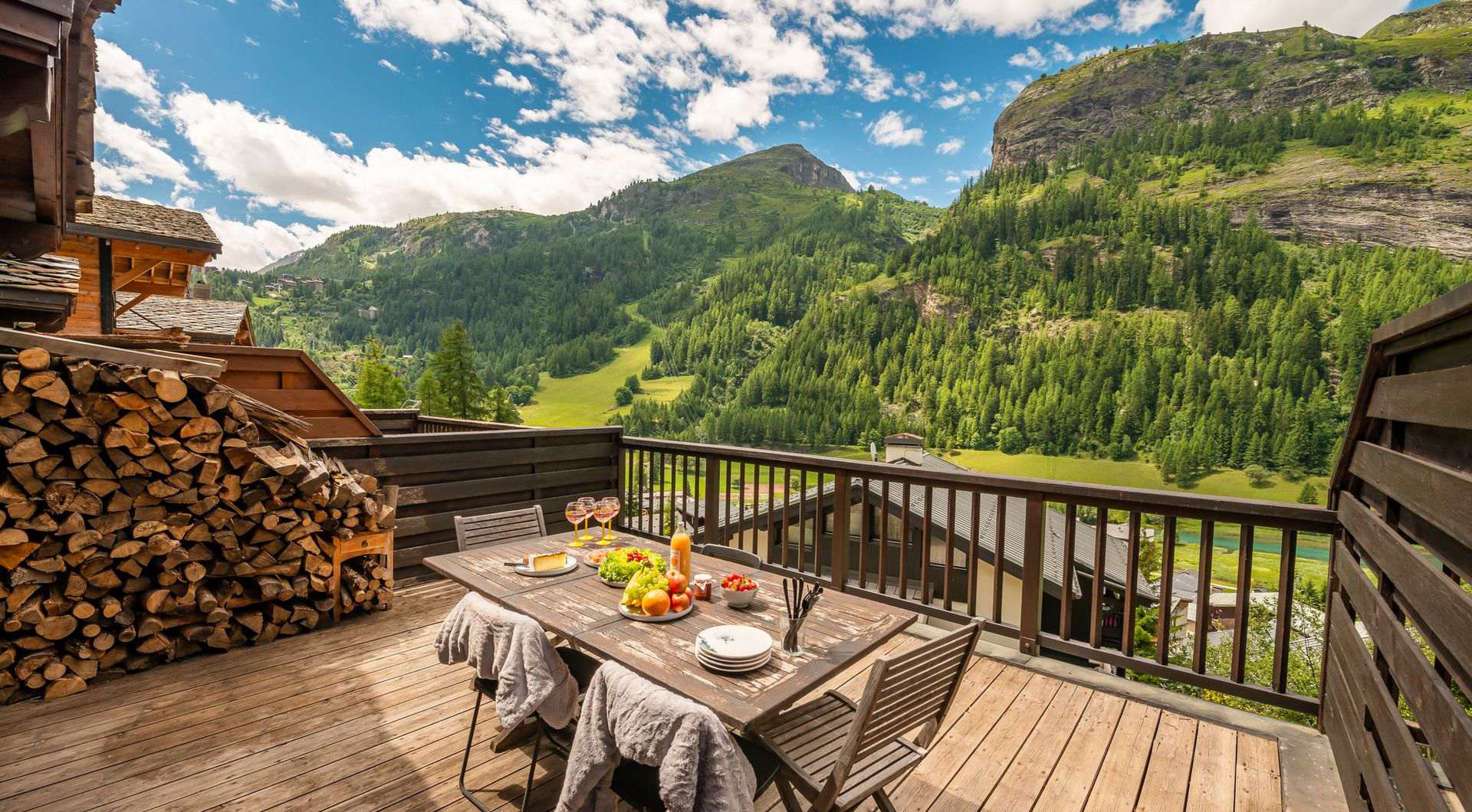 Grande terrasse ensoleillee avec mobilier de jardin, stockage du bois de chauffe, belles vues sur les pistes et montagne