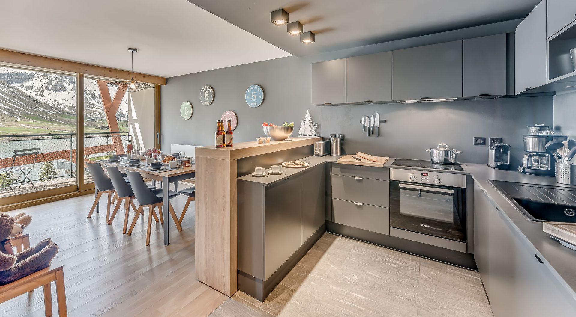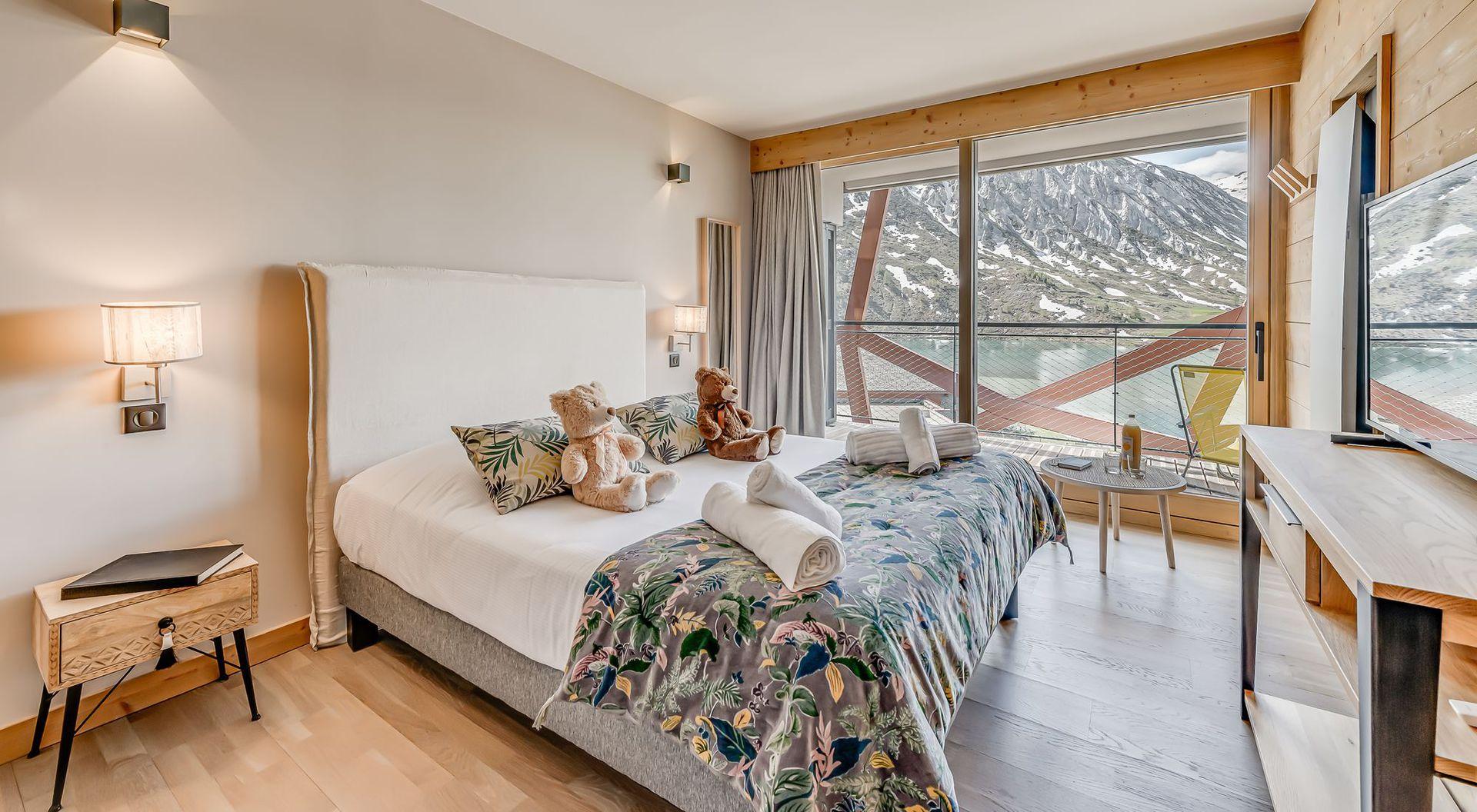 Il possede un balcon exposee plein sud, avec vues exceptionnelles et degagees sur le lac naturel de Tignes, les massifs de Toviere et le glacier de la Grande Motte