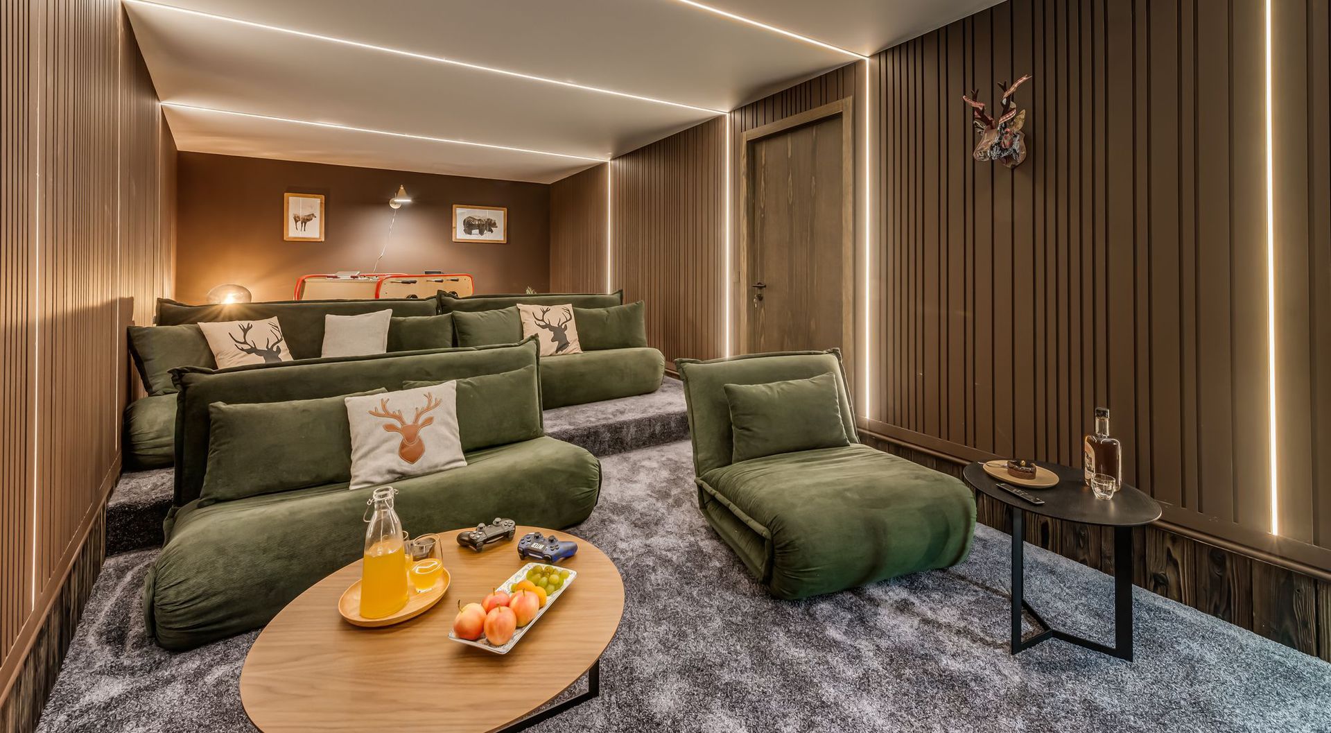 Ensemble de fauteuils, Ecran large cinema, barre de son, baby foot Bonzini.