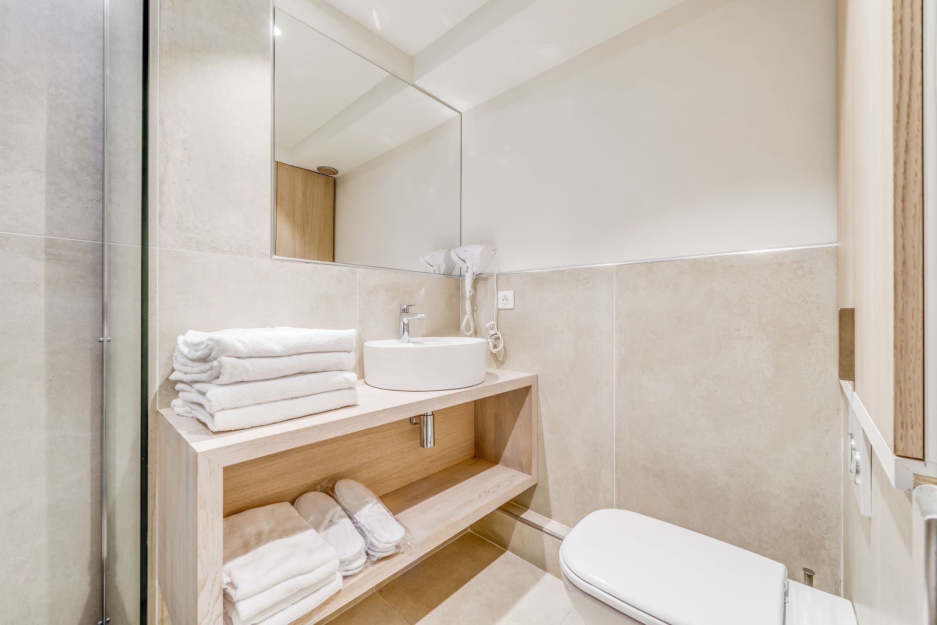 - 1 Salle de bain douche avec meuble vasque, radiateur seche serviettes, WC.