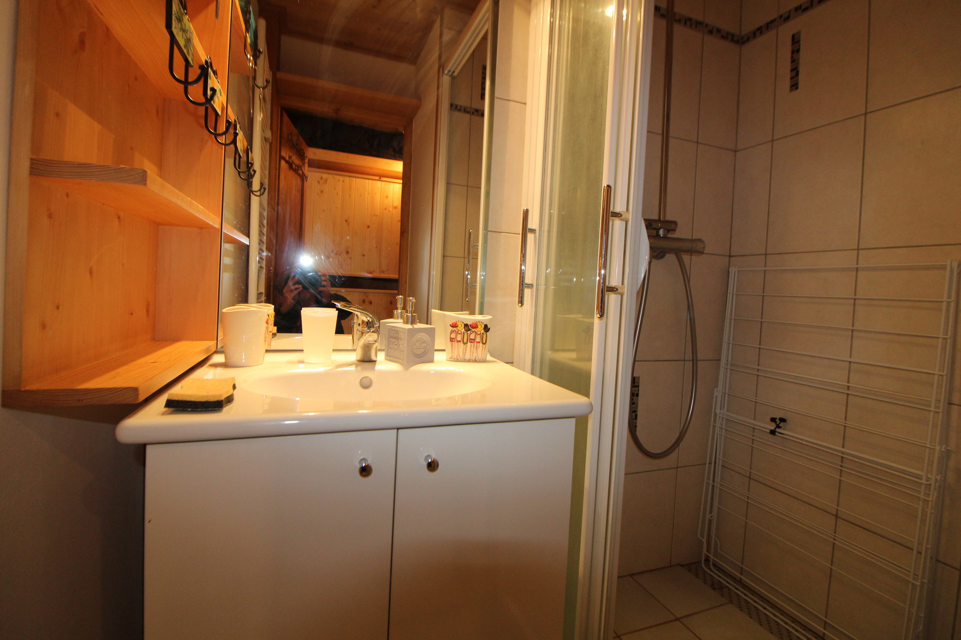 - Salle de bain avec meuble vasque et douche.
