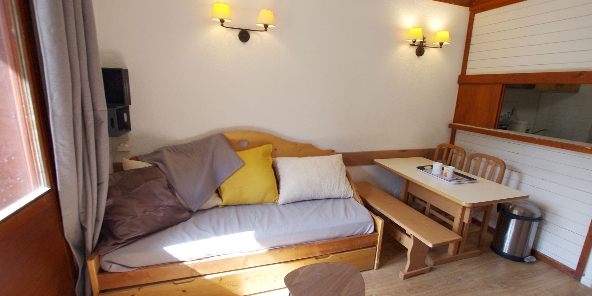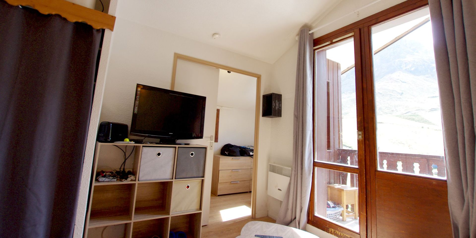- 1 Sejour, salon, coin repas avec canape lit gigogne, TV, placard de rangement et sortie sur Balcon SUD