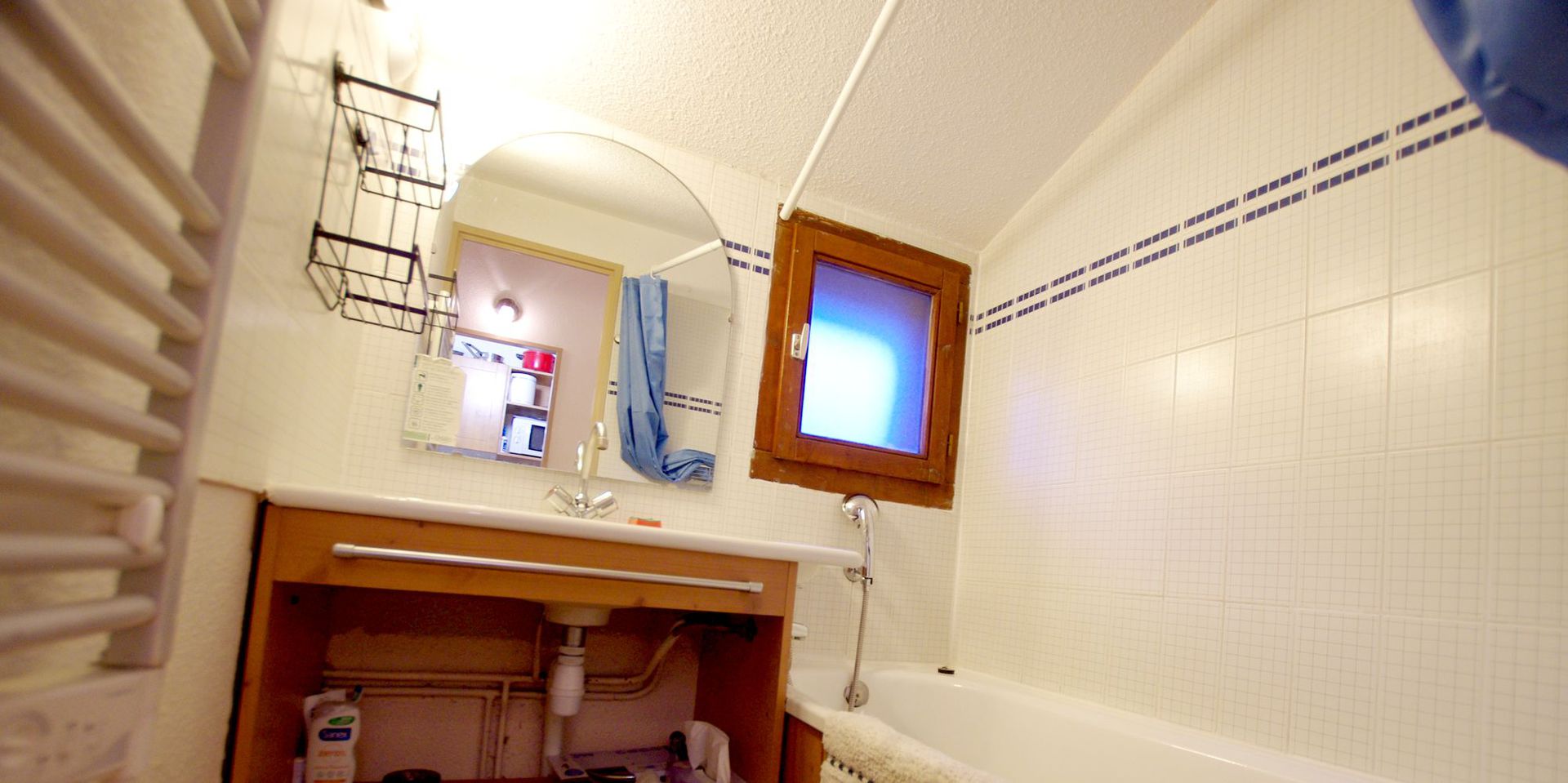 - 1 salle de bain avec baignoire, meuble vasque, radiateur seche serviette, fenetre EST