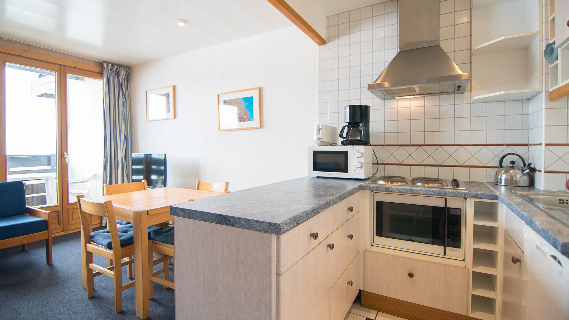 Cuisine : Plaques electriques, micro ondes, cafetiere a filtre, four, refrigerateur et lave-vaisselle.
