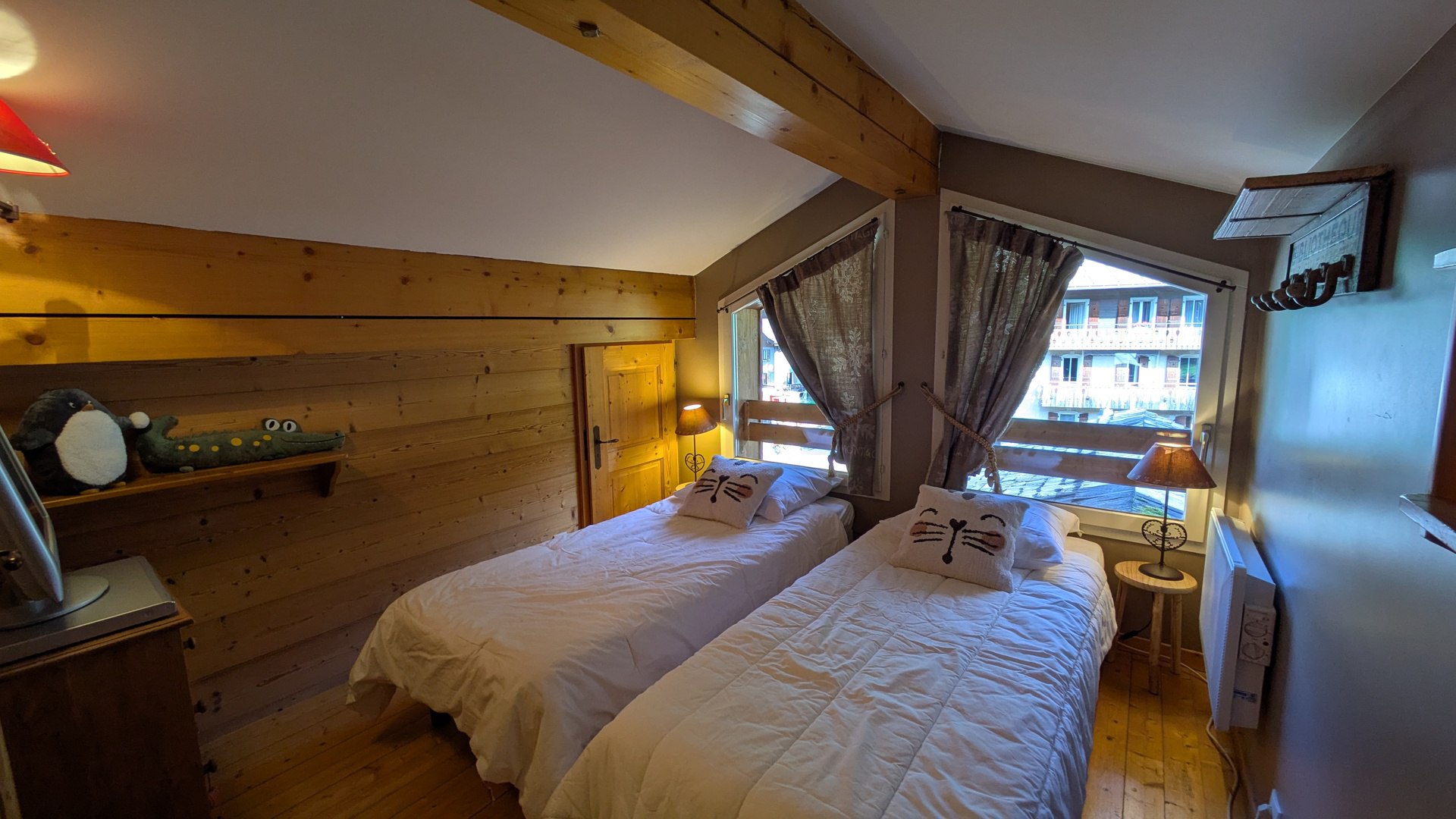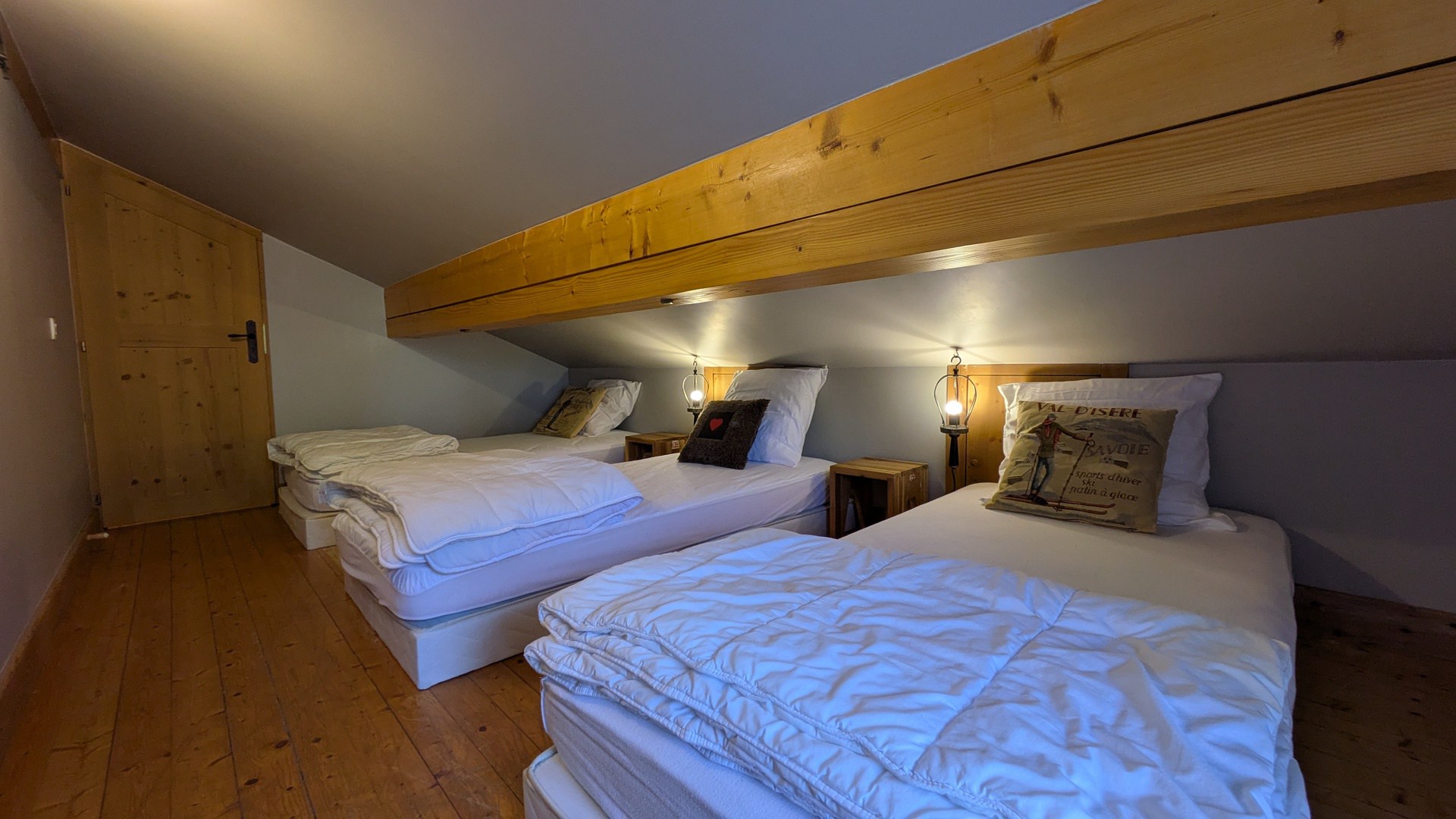 Etage superieur : Chambre 2 en partie mansardee (12 m2) : 3 lits simple, placard, baie vitree acces balcon sud vue pistes - Chambre 3 (10 m2) : 2 lits simples, placard, TV pour lecteur DVD, fenetre nord vue village - Chambre 4 entierement mansardee (10 m2) : 3 lits simples, placard, porte fenetre acces balcon sud vue pistes.