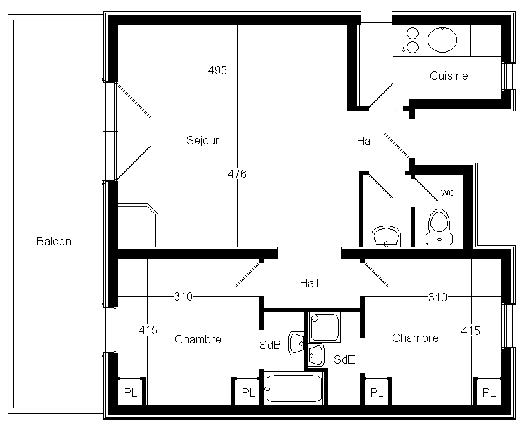 Hall - Cuisine (5 m2) : Refrigerateur-congelateur, lave-vaisselle, cuisiniere au gaz avec four, micro-ondes, hotte, machien a cafe Senseo, fenetre nord vue piscine - wc avec lavabo - Sejour (24 m2) avec Coin repas : Table et chaises - Coin salon : canape, television, table de salon, baie vitree acces balcon - Chambre 1 (12 m2) : 2 lits, placards, porte-fenetre acces balcon sud vue village, salle de bains : Baignoire sabot, lavabo - Chambre 2 (12 m2) : 2 lits, placard, fenetre nord vue piscine, salle d'eau : Douche et lavabo,