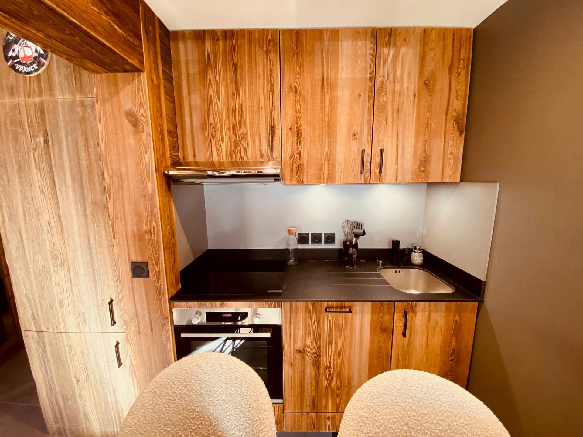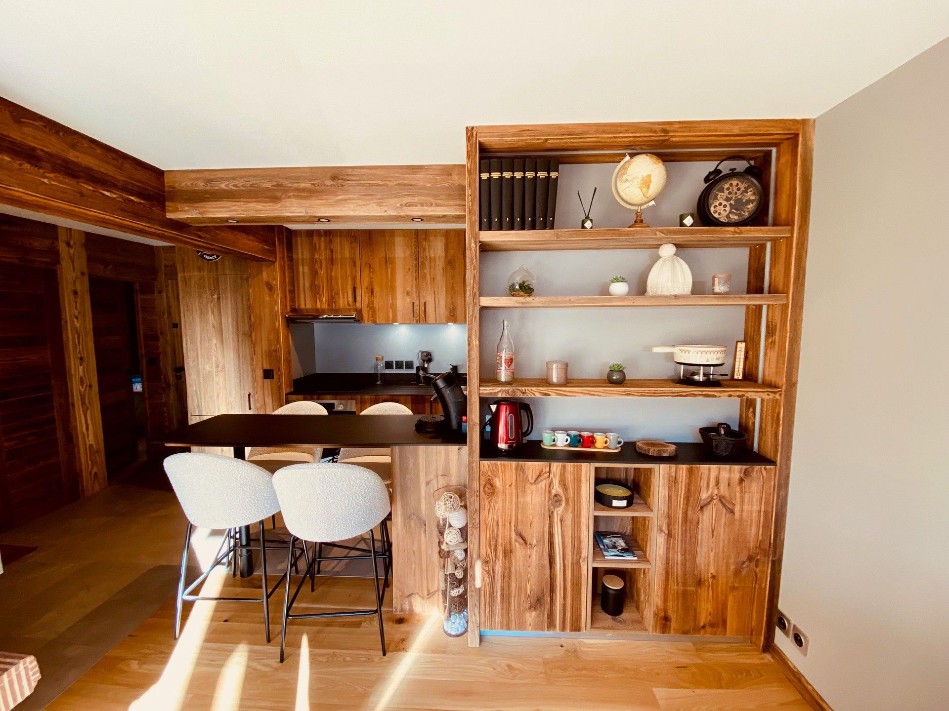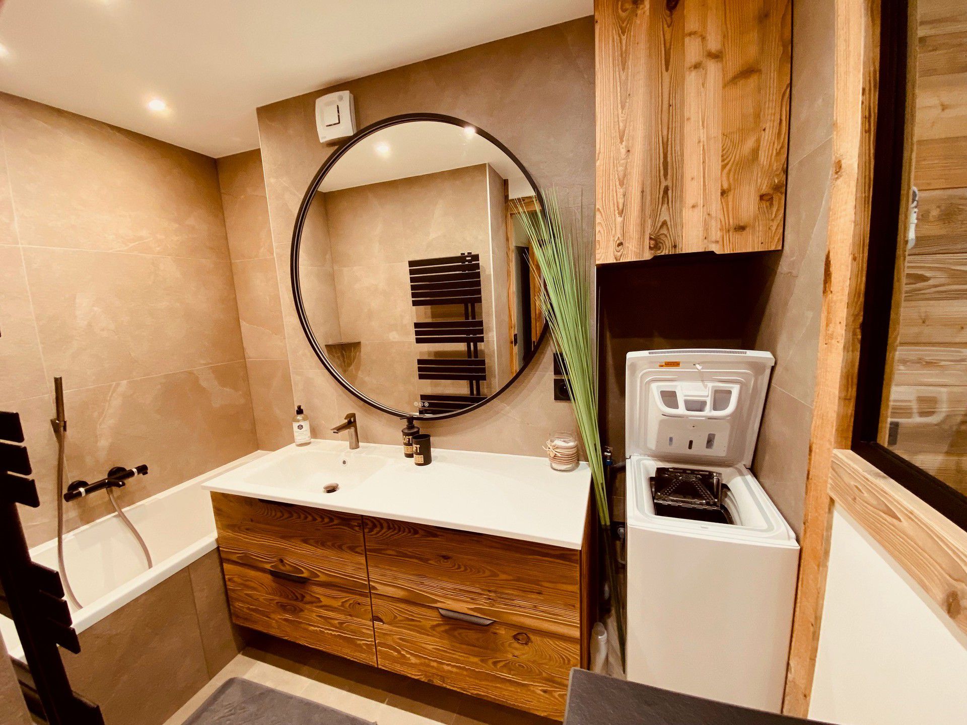 Entree/Hall (5.71m2) : Chambre suite 2 (11.19m2) : 1 lit double, placard, TV, fenetre nord vue Perriere, salle de bain (3.61m2) : baignoire, lavabo, lave-linge - wc separe - Salle d'eau (1.93m2): douche, lavabo - Chambre 1 (9.05m2) : 2 lits simple, placard, TV, baie vitree acces balcon est et sud, vue pistes et village - Sejour (17m2) avec Coin salon : Canape, television, table basse - Coin repas : Table et chaises pour 4 personnes, baie vitree acces balcon - Coin cuisine equipee : Refrigerateur 270L, congelateur, plaques vitroceramiques 3 feux, hotte, four, bouilloire, grille-pain, cafetiere Senseo, appareil a fondue, evier, plan de travail, placards hauts et bas, passe-plat table, baie vitree avec acces balcon