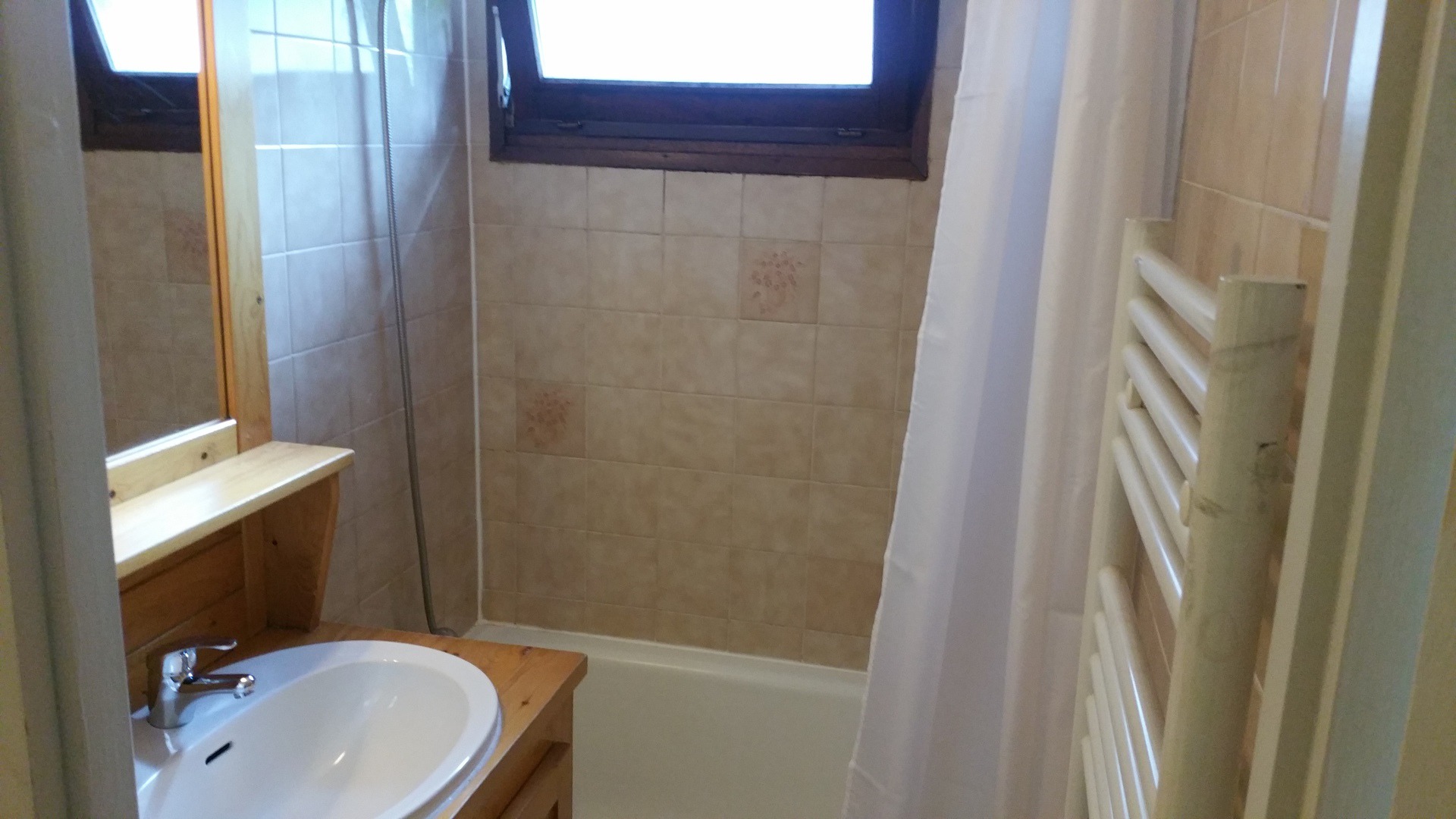 Etage principal : Entree/Hall - Coin nuit en couloir avec lits, Salle de bains (2m2) avec baignoire, lavabo, radiateur seche-serviettes, fenetre - WC separe avec cumulus eau chaude - Sejour (15.77m2) avec Coin salon : Canape, TV, table basse, baie vitree acces balcon Sud, vue montagne et village - Coin repas : Table, chaises - Coin cuisine equipee neuve: Plaque vitroceramique 4 feux, refrigerateur, lave-vaisselle, four, hotte, placards.
