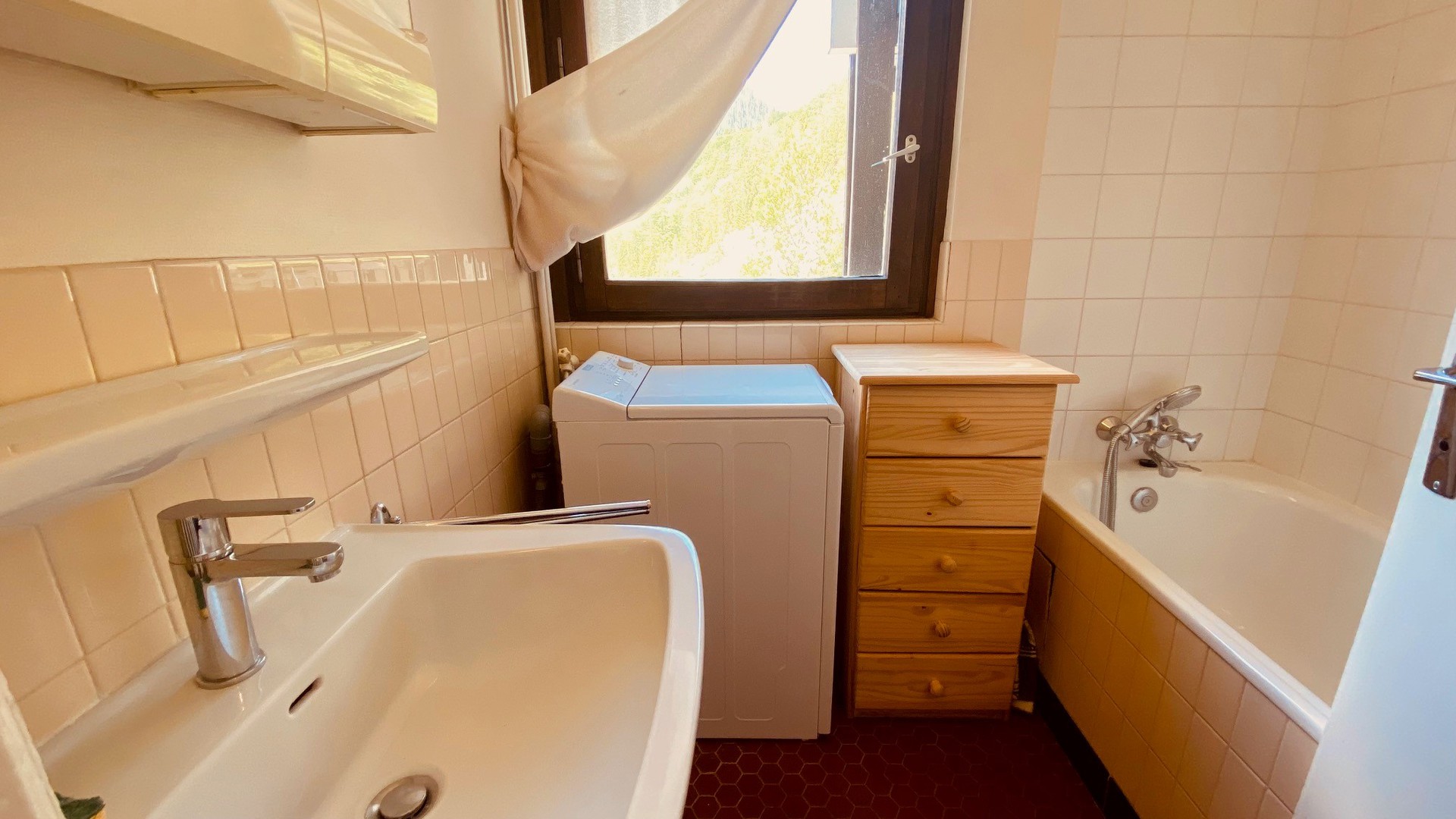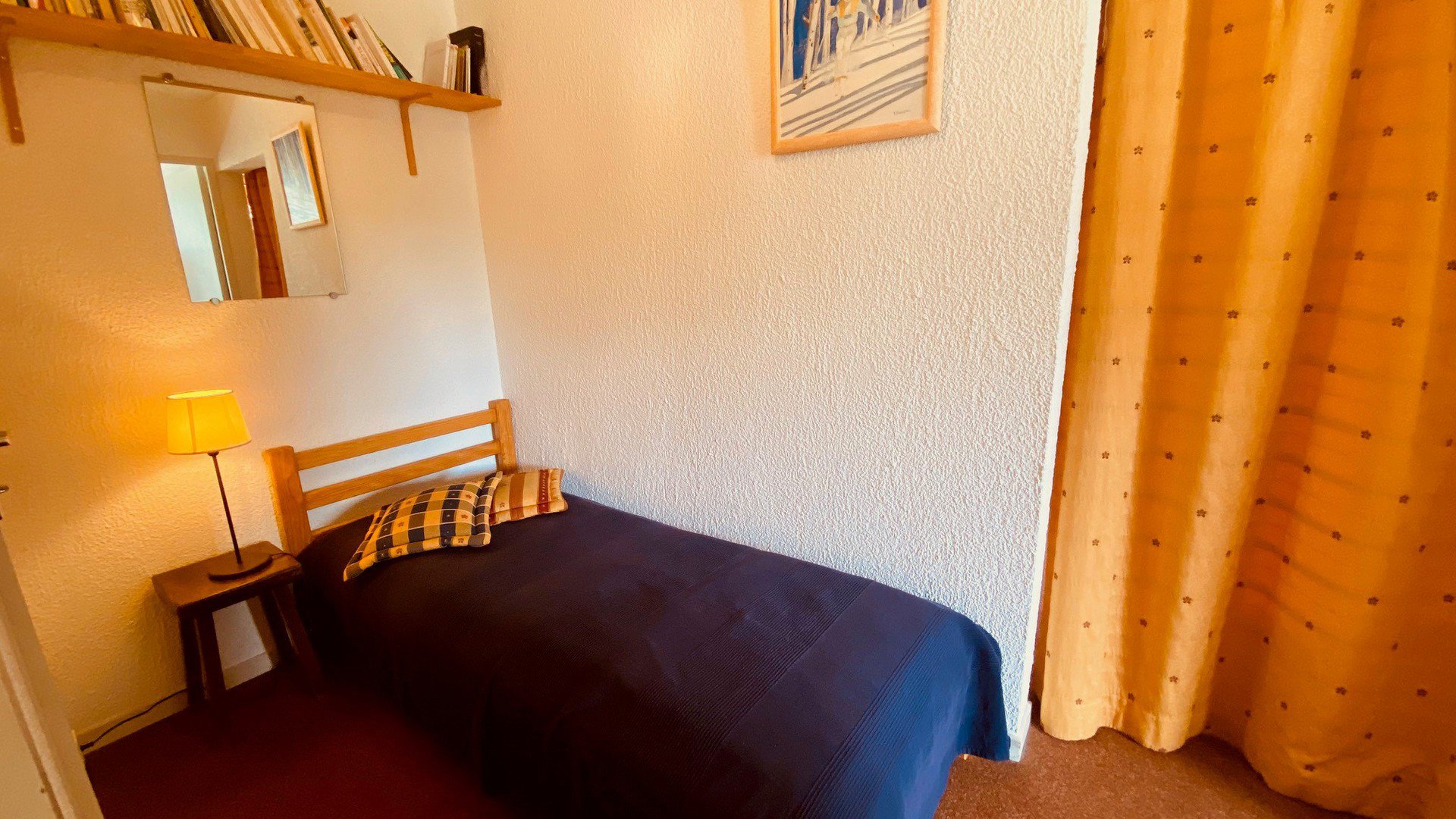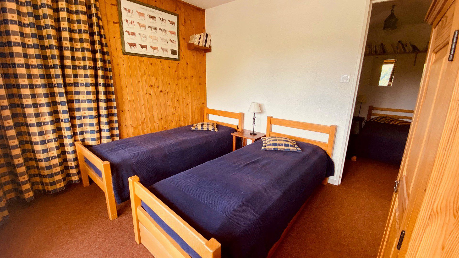 Entree/Hall (4.65 m2) : Placard penderie - wc - Sejour (15 m2) avec Coin salon : Canape, television, table basse, baie vitree acces balcon sud - Coin repas : Table et chaises - Coin cuisine equipee (3 m2) : Cuisiniere electrique avec four, refrigerateur (100L), lave-vaisselle, micro-ondes, machine a cafe Tassimo, placards, bar passe-plat - Chambre (9.56 m2) : 2 lits, placard, porte fenetre + fenetre sud vue village - Salle de bains : Baignoire, lavabo, lave-linge - Coin nuit couloir (4.50 m2) : lit - Placard (1.50 m2)