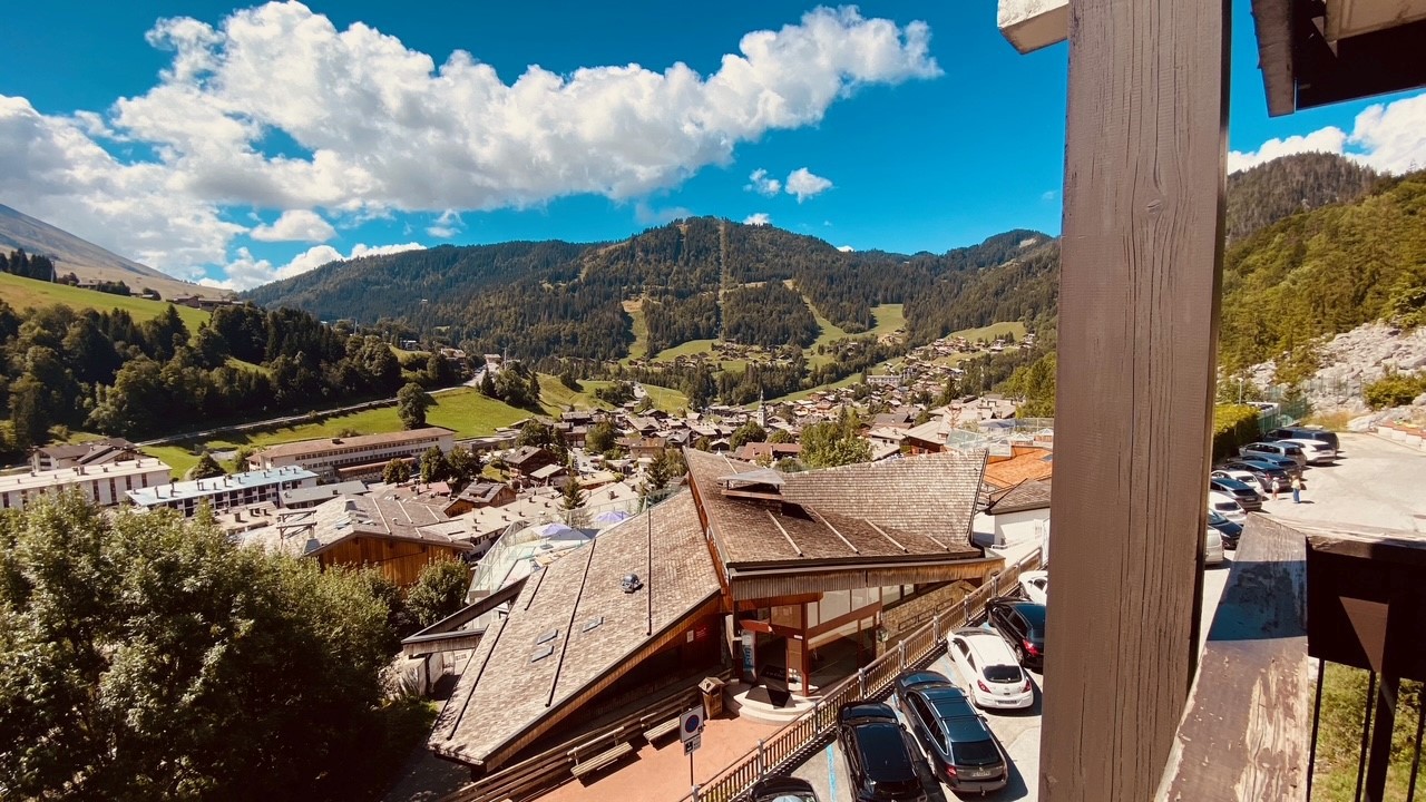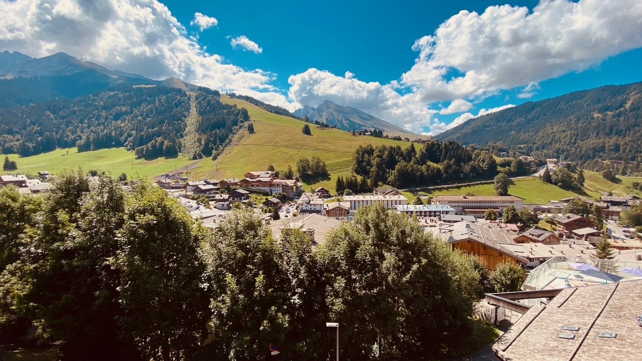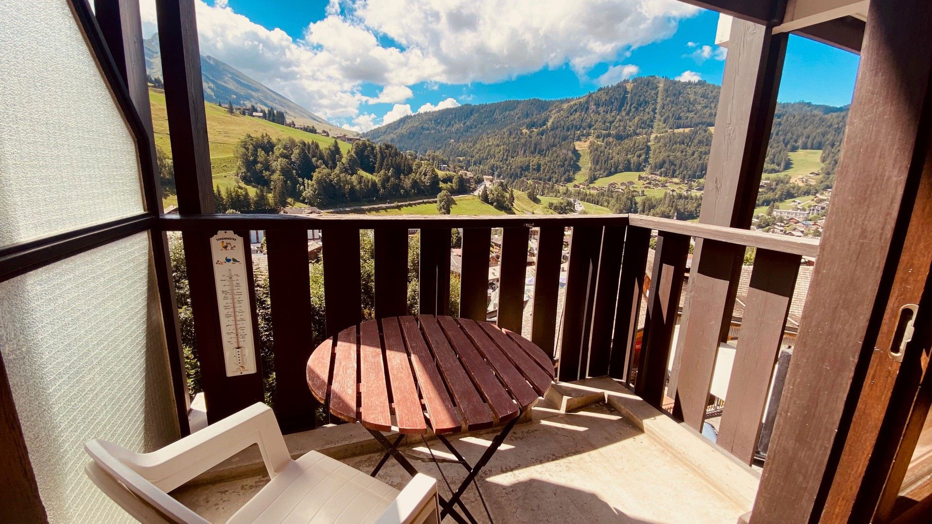 Entree/Hall (4.65 m2) : Placard penderie - wc - Sejour (15 m2) avec Coin salon : Canape, television, table basse, baie vitree acces balcon sud - Coin repas : Table et chaises - Coin cuisine equipee (3 m2) : Cuisiniere electrique avec four, refrigerateur (100L), lave-vaisselle, micro-ondes, machine a cafe Tassimo, placards, bar passe-plat - Chambre (9.56 m2) : 2 lits, placard, porte fenetre + fenetre sud vue village - Salle de bains : Baignoire, lavabo, lave-linge - Coin nuit couloir (4.50 m2) : lit - Placard (1.50 m2)