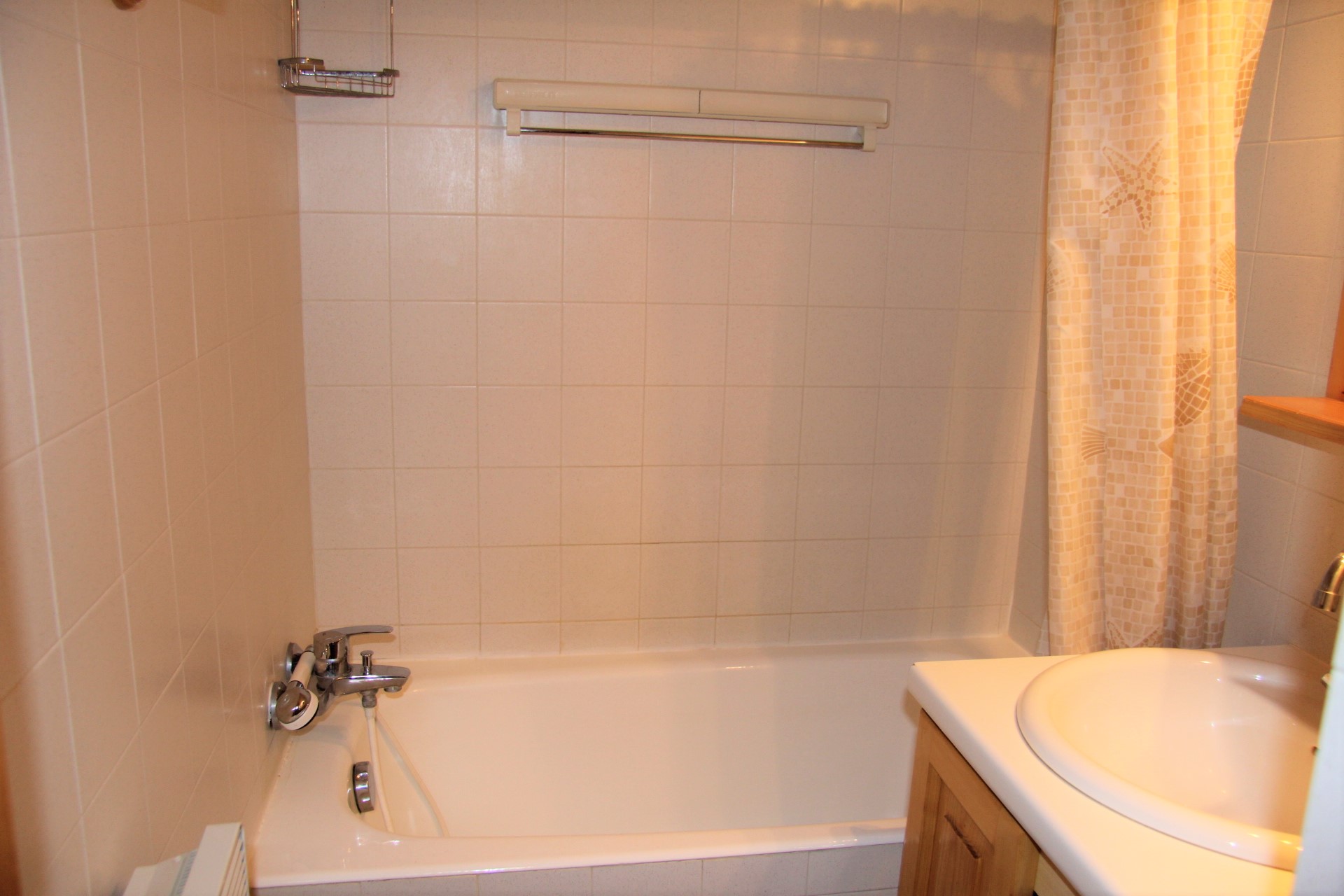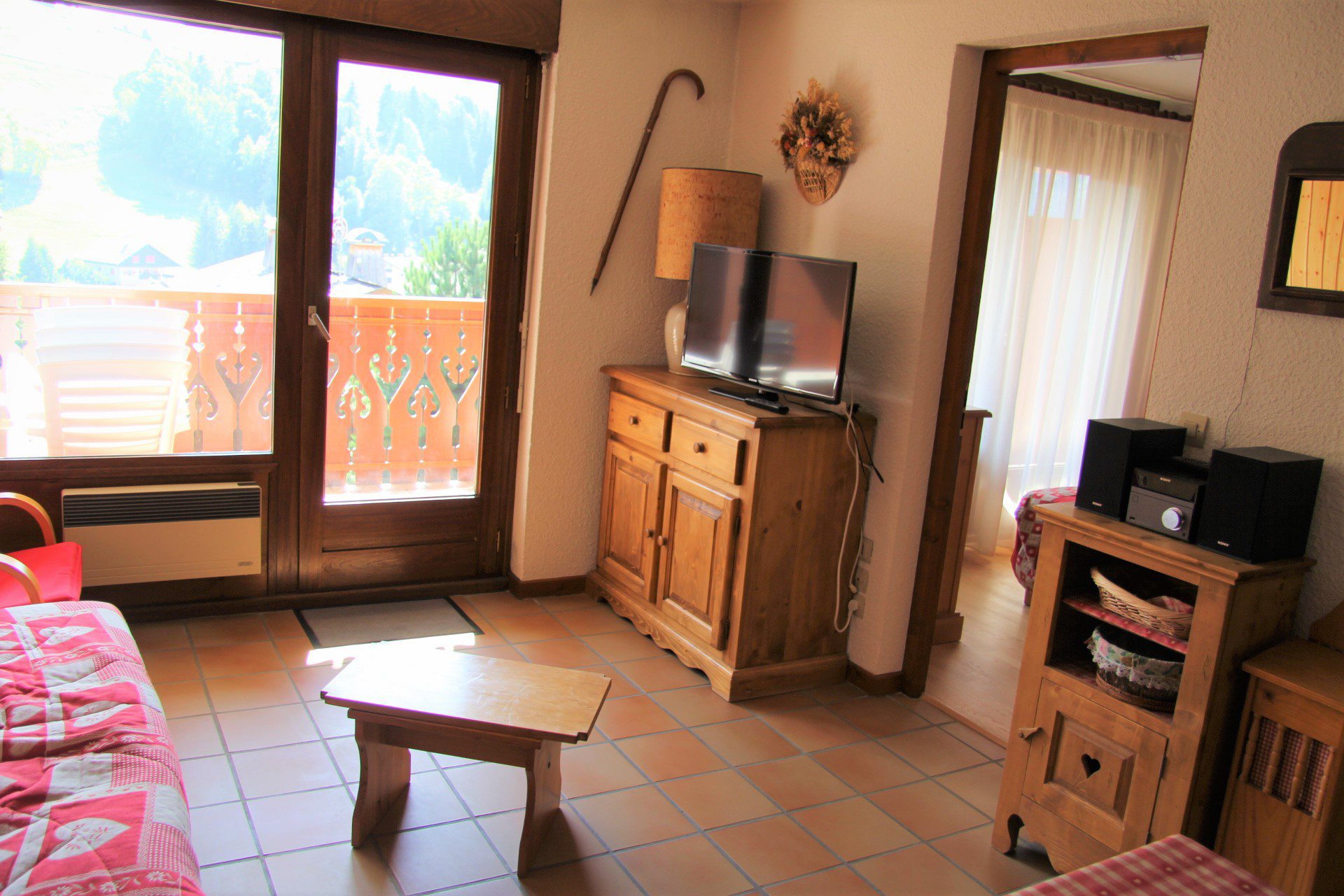 Entrée/Hall : Alcôve avec placard penderie - wc - Salle de bains : Baignoire, lavabo - Chambre (8,22 m²) : Lit, baie + porte fenêtre accès balcon, vue village - Salle de séjour (14 m²) avec Coin salon : Canapé, télévision, table basse - Coin repas : Table et chaises - Coin Cuisine équipée (2,56 m²): Plaque induction 3 feux, micro-onde, lave-vaisselle, frigo.