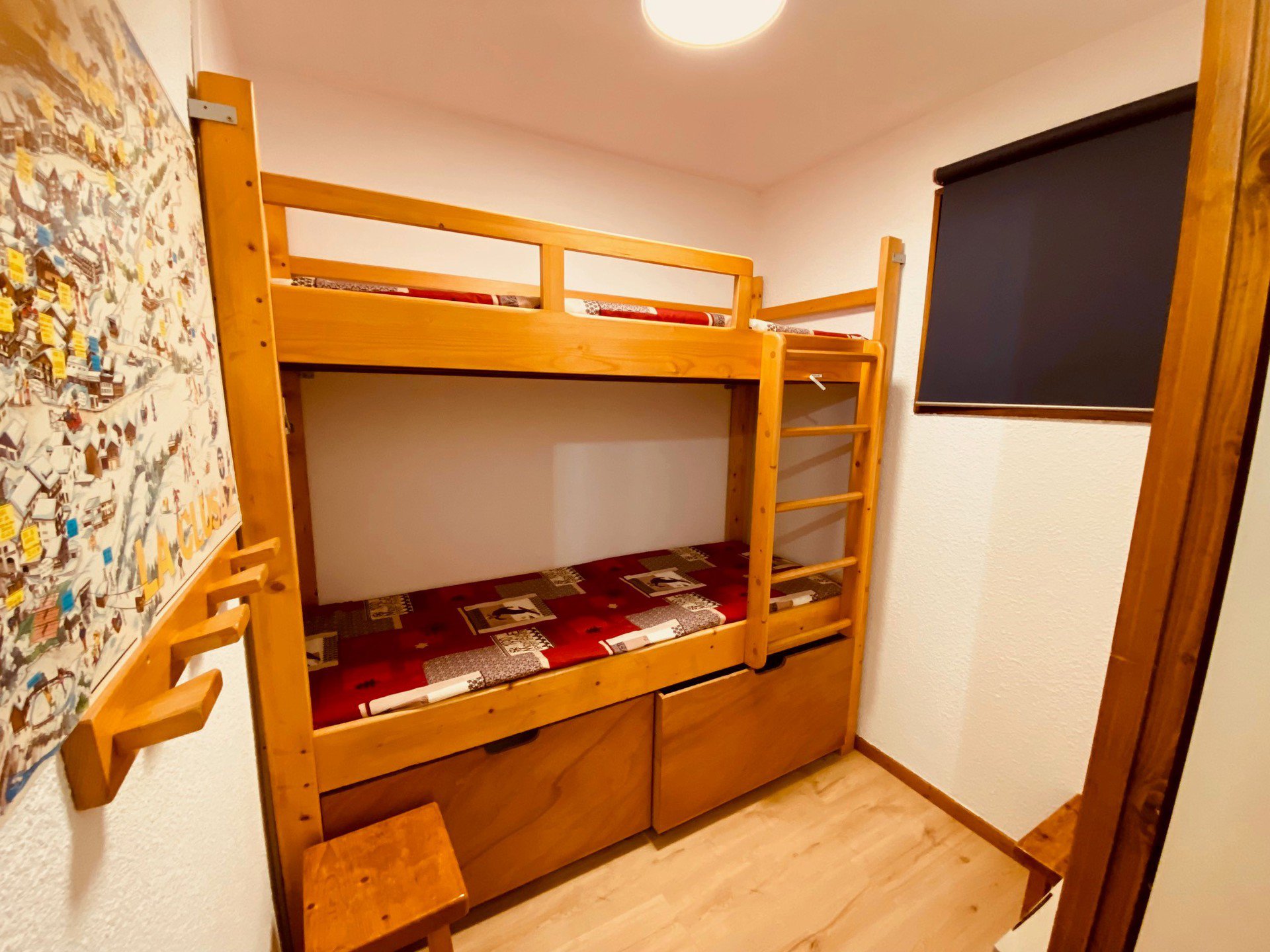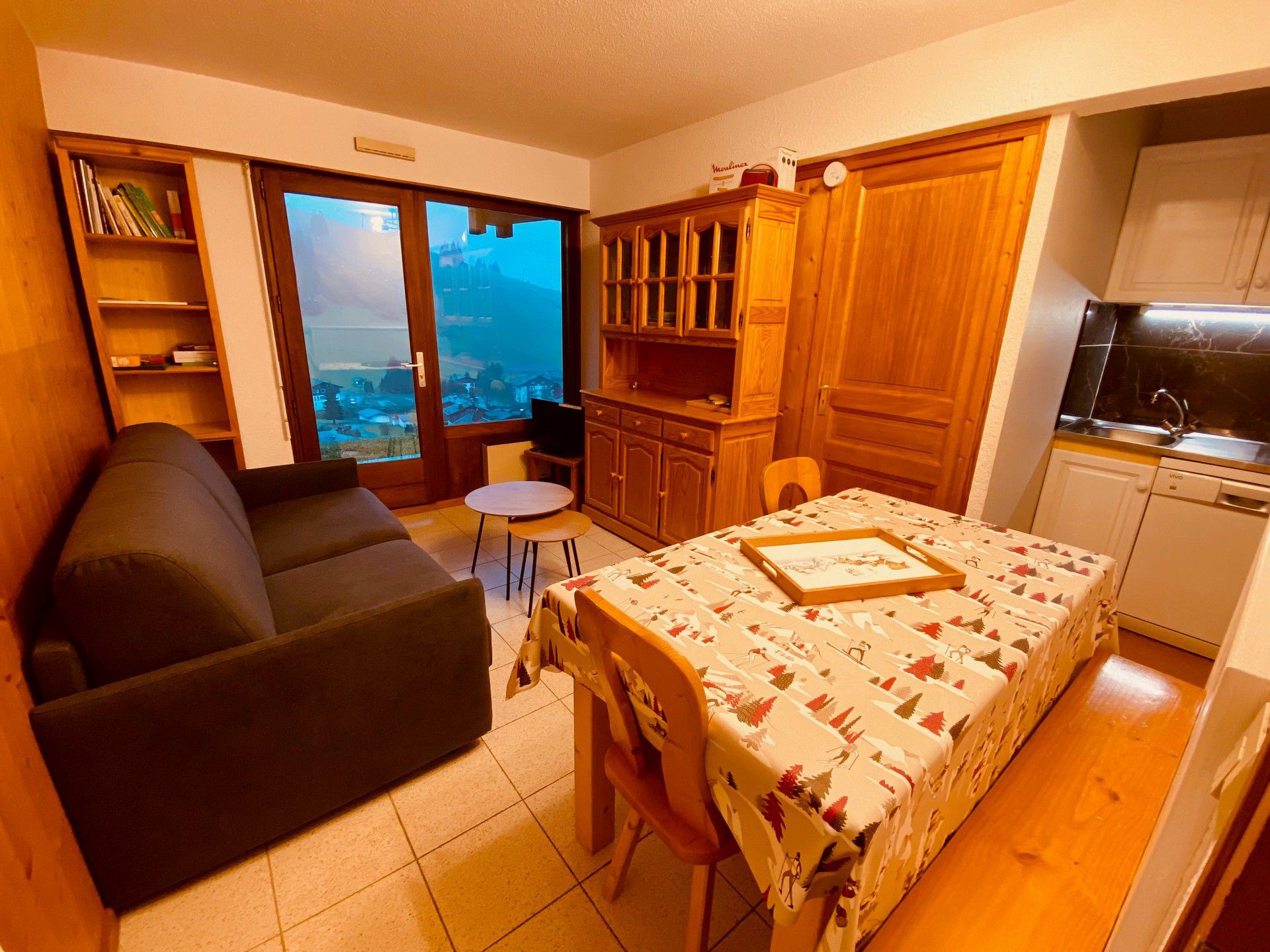 Entree/Hall (3.96m2) desservant : Cabine fermee avec porte et fenetre nord, lits - Salle de bain (2.57m2) baignoire, vasque, seche-cheveux, radiateur seche-serviettes - WC avec ballon d'eau chaude - Sejour separe par une porte avec Coin repas : table et chaises - Coin salon : television, canape lit, tables de salon, porte-fenetre acces terrasse amenage + bande de terrain, vue dominante sur chaine des Aravis et village, coin cuisine equipee ouverte sur sejour: refrigerateur, four, hotte, plaques de cuisson 3 feux, micro-onde, bouilloire, cafetiere electrique a filtre, grille-pain, appareil a raclette, placards hauts et bas, plan de travail avec evier encastre - Chambre: lits, placard, baie vitree donnant acces sur la terrasse sud, vue montagne.