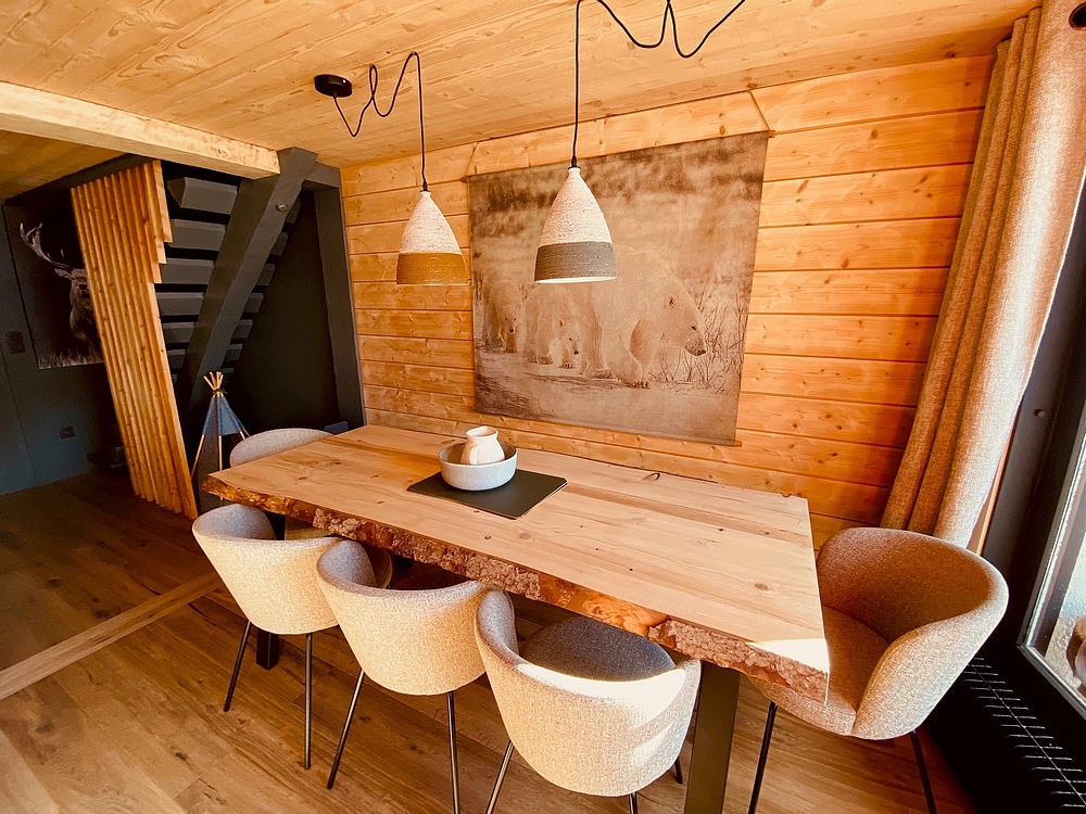 Entrée/Hall: placard-penderie et placard sèche-chaussures- Séjour avec coin salon : canapé, fauteuils, table basse, télévision, poêle à bois, Coin repas : Table et chaises, baie vitrée accès balcon sud, vue montagne et village - Coin cuisine équipée : plaques de cuisson, four, hotte, lave-vaisselle, réfrigérateur, évier, plan de travail, placards de rangement, bouilloire, grille-pain, machine à café Nespresso, appareil à raclette, appareil à crêpes - Escaliers accès étage : Chambre 1 (m²): 1 lit 160 cm, placard penderie, TV, fenêtre sud vue pistes et village - Salle de bains (m²) : Baignoire, lavabo, lave-linge - WC séparé - Chambre 2 (m²) : 1 lit 140 cm, placard penderie, fenêtre nord - Chambre 3 (m²) : 2 lits 90cm 1 personne avec possibilité de lit double pour 2 personnes, placard penderie, fenêtre nord.