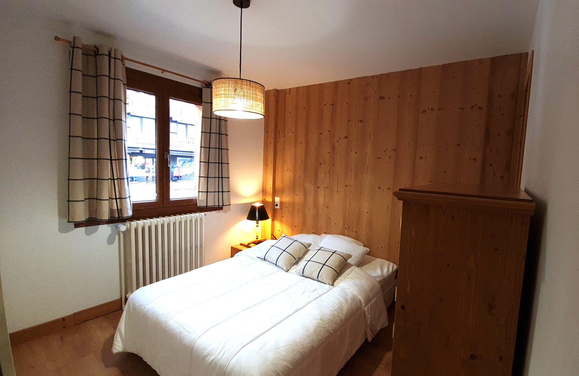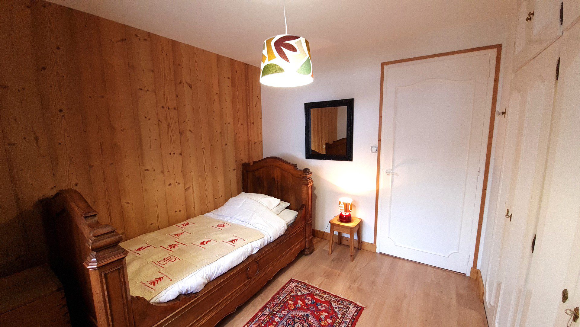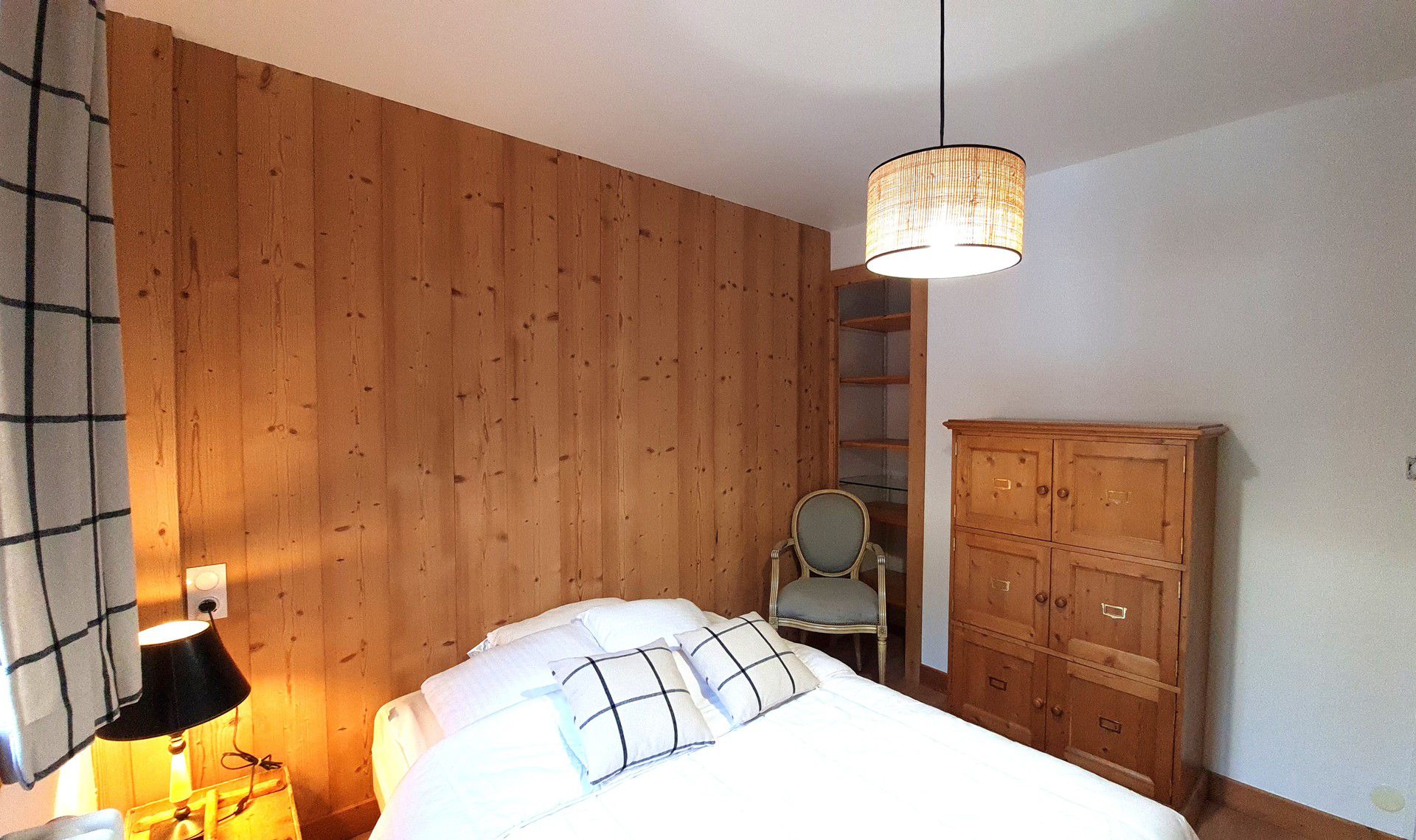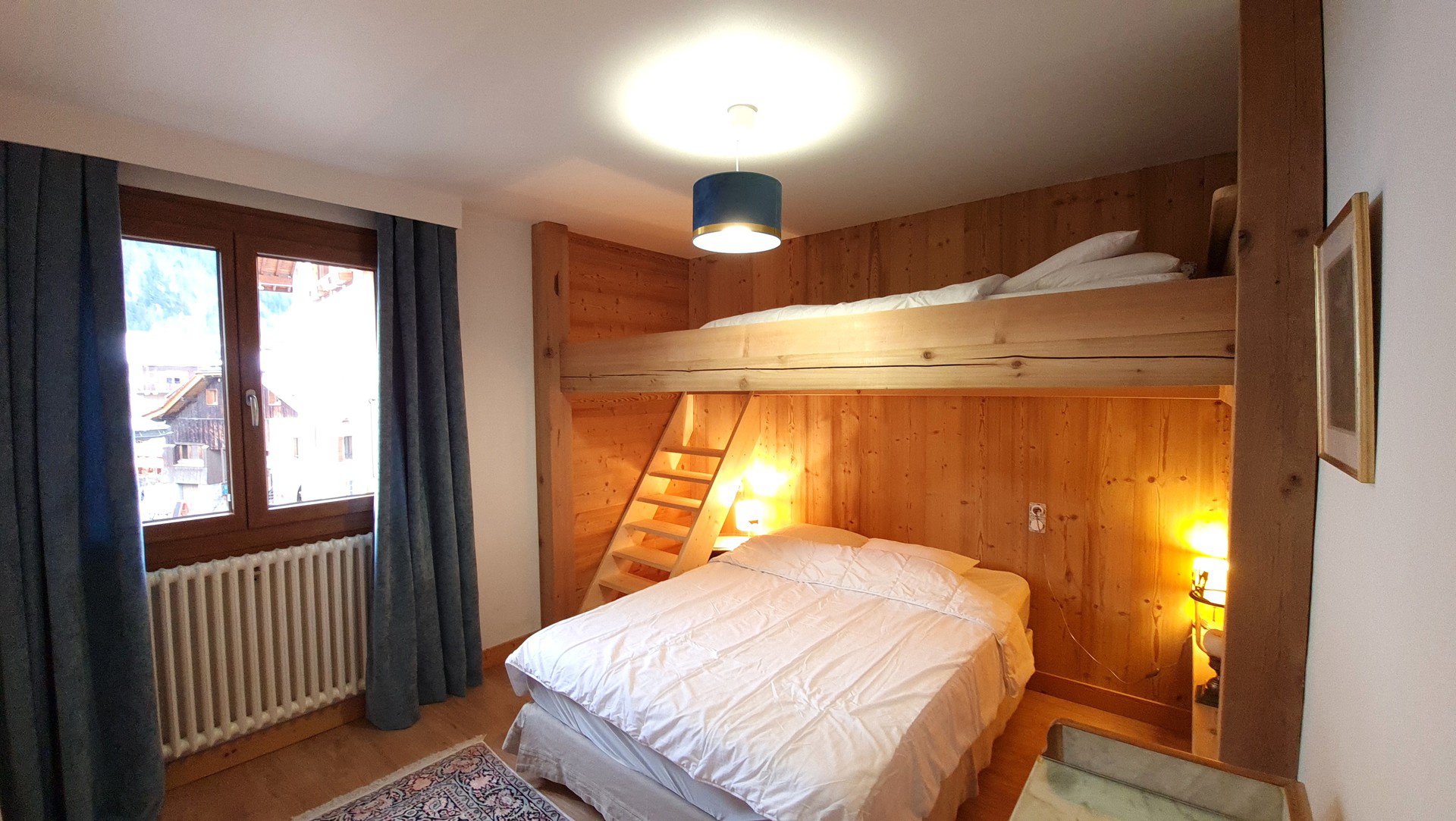 Etage principal : Entree/Hall - Coin repas : Baie vitree vue eglise et montagne, table et chaises pour 6 personnes, vaisselier et un fauteuil - Sejour : Baie vitree vue village et montagne, 1 grand canape d'angle, armoire avec television, table basse - Coin cuisine : plaques electriques 3 feux, hotte aspirante, four, lave-vaisselle, frigo + congelateur (207L + 85L), cafetiere a grains, placards, appareil a raclette et fondue, grille pain, bouilloire - Chambre 1 : 1 lit en 80, grande penderie, fenetre - WC - Salle de bains : Baignoire, lavabo, seche-serviettes - Chambre 2 : 1 lit en 140 + 1 lit superpose en 80, fenetre - Chambre 3: 1 lit 140cm, grand dressing, fenetre.