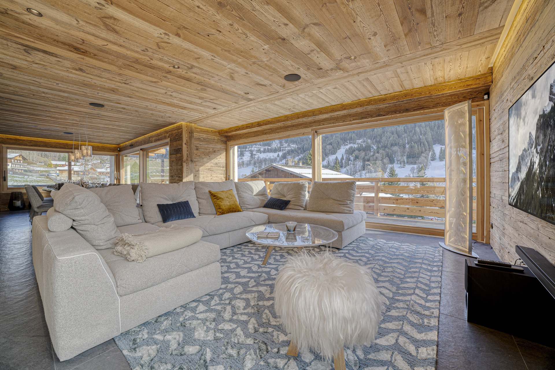 Etage : Grande pièce à vivre (100 m²) : Deux baies vitrées de 5 et 6 m de large face aux montagnes des Aravis - Coin salon : TV avec grand canapé d’angle, table de salon - Coin salon ; 2 avec canapé, fauteuils, bibliothèque - Cheminée centrale moderne circulaire verticale vitrée et pivotante - Cuisine entièrement équipée (Plaques Induction, 2 fours électriques, évier, plan de travail, hotte, lave-vaisselle, machine à café Nespresso, nombreux placards de rangement) - Coin repas avec table en chêne massif pour 14 personnes face baie vitrée, vue montagne -Piscine extérieure (7,5m x 3,3m) chauffée avec buses de massages, grande terrasse avec vue sur la chaîne des Aravis.