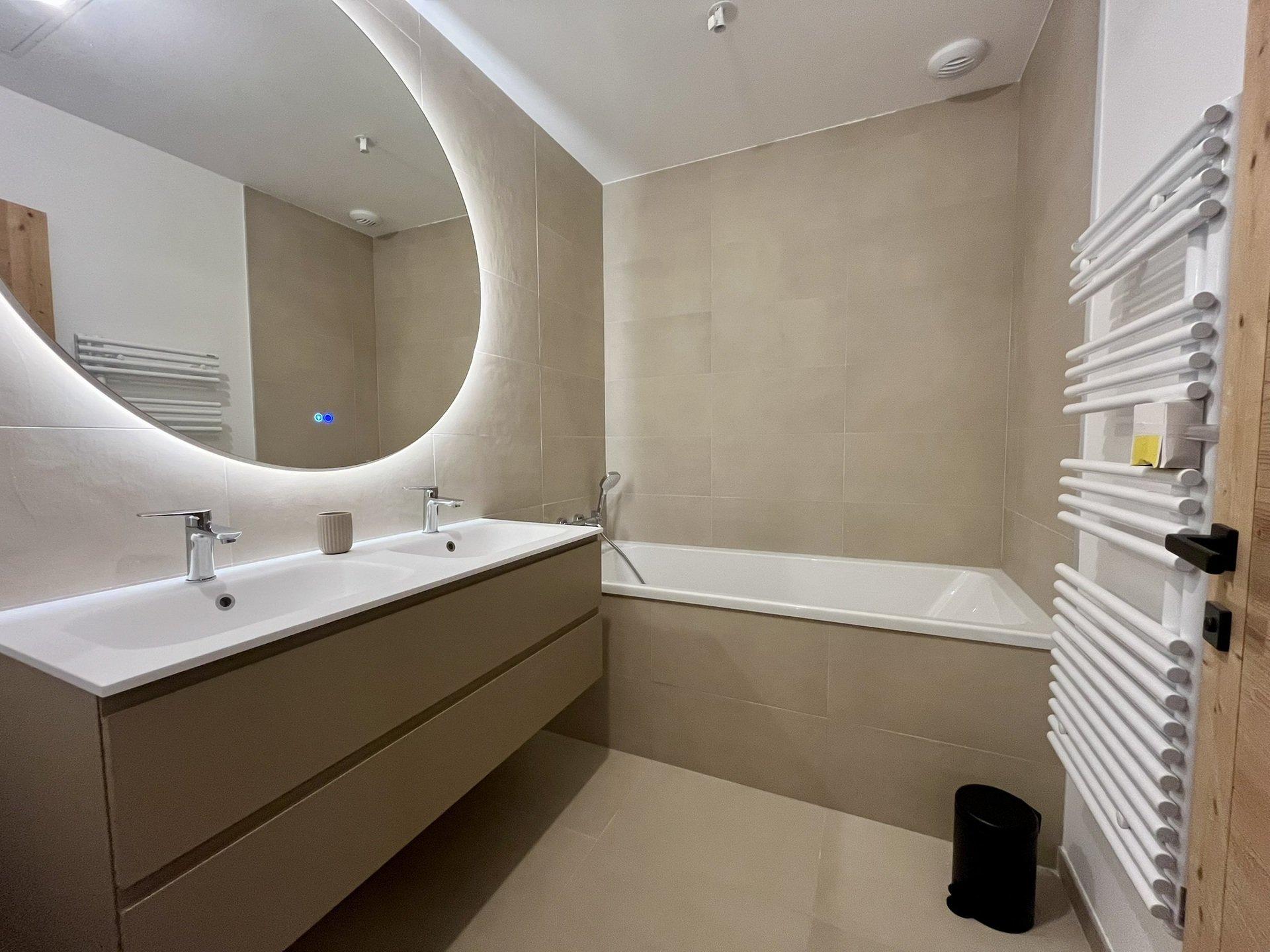 Au premier etage : Chambre 1 (12.41 m2) avec lit 160 cm, salle d'eau attenante (3.68 m2 dont 1 m2 <1.80m): douche, lavabo, miroir, radiateur seche-serviettes, WC, seche-cheveux, acces balcon - Chambre 2 (11.73 m2) avec 1 lit 160 c, acces balcon - Chambre 3 (8.55 m2) avec lit 160 cm, acces balcon - Salle de bain (4.26 m2): baignoire, double vasque, miroir, radiateur seche-serviettes - WC (1.36 m2). Service para-hotellerie : menage de fin de sejour inclus (hors poubelles et vaisselle), linge fourni, lits faits a l'arrivee, materiel puericulture : Lit Bebe + Chaise haute + Chauffe biberon. Chauffage au sol - Couettes - Animaux non autorises - Logement non-fumeur - Wifi- Classement en cours: **** pour 6 personnes - Non accessible et adapte aux personnes a mobilite reduite (marches pour acceder au chalet et escaliers interieurs). Possibilite de reserver un autre demi-chalet en complement pour un total de 12 personnes)