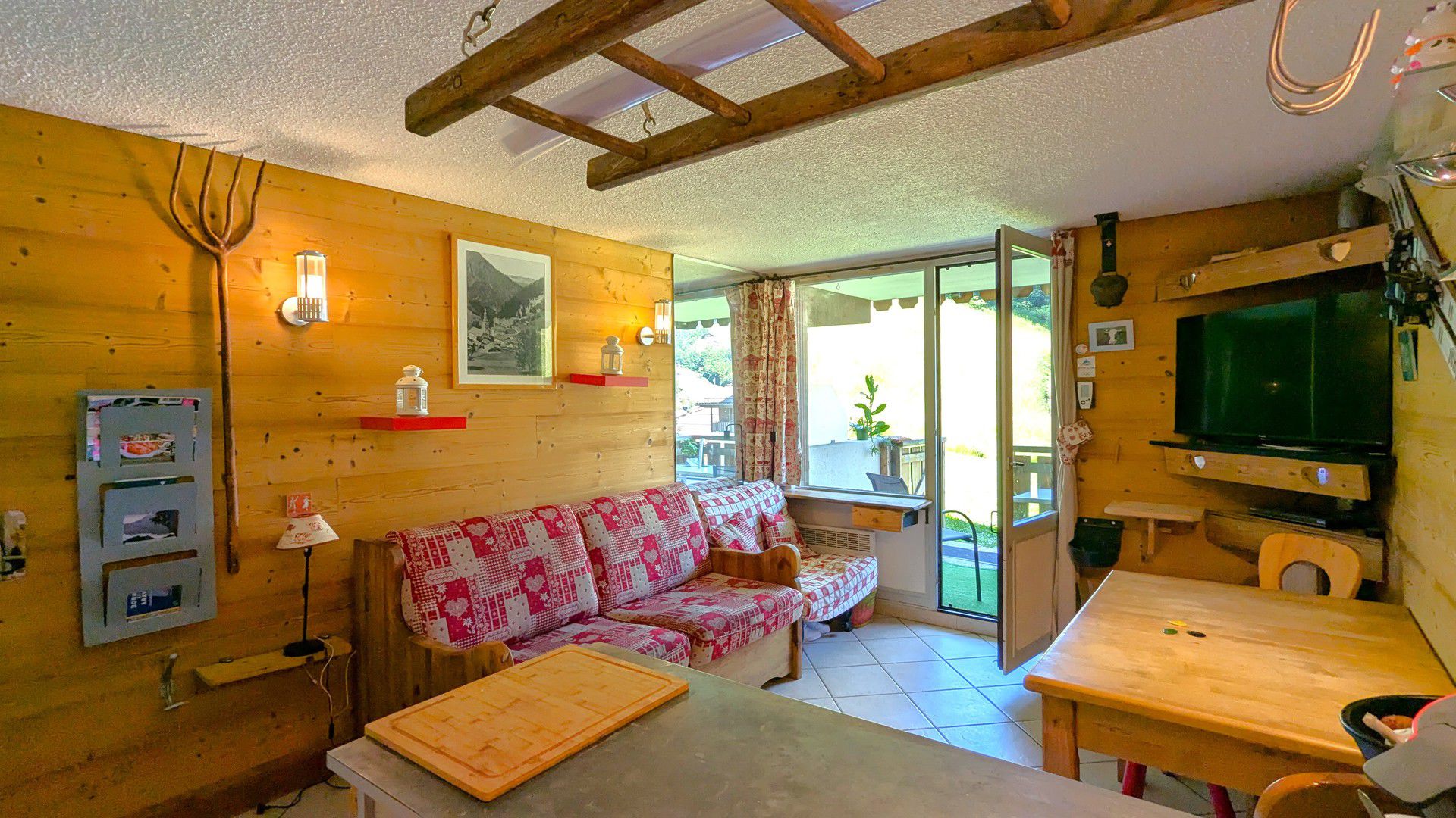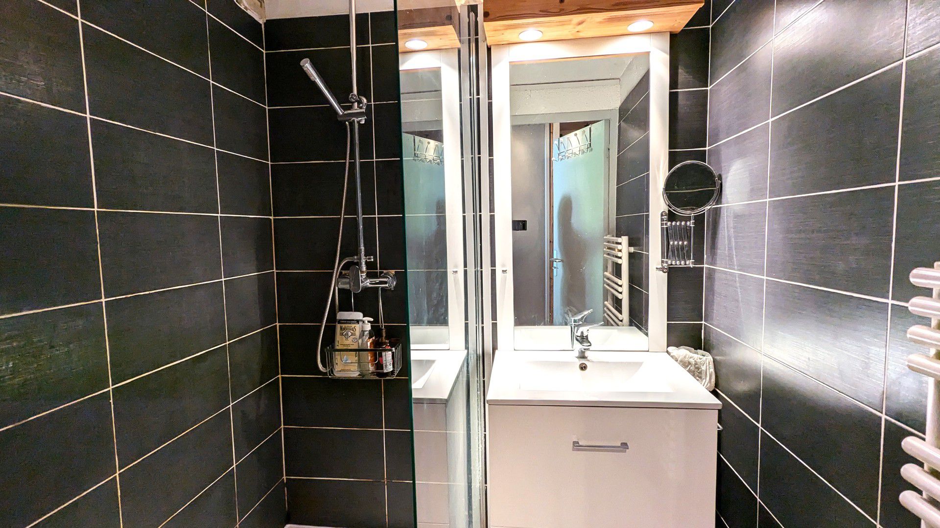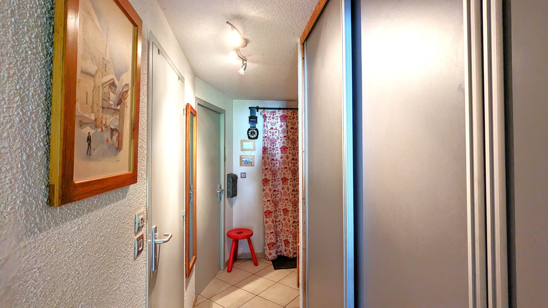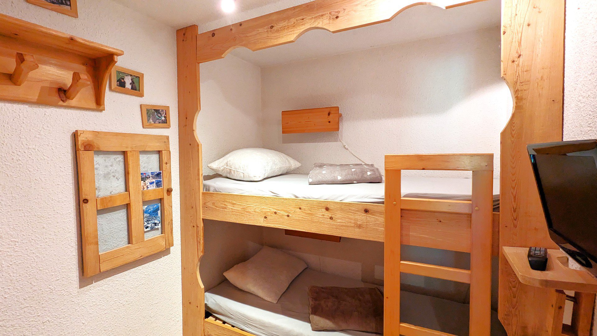 Entree/Hall avec fauteuil, miroir et rangements - Cabine (4.90m2) : 2 lits superposes, placards/penderie - Salle d'eau (2.50m2): Douche, lavabo, radiateur seche-serviette - WC independant (1.15m2) - Sejour (15.84m2) avec coin salon : canape Rapido 140cm, television connectee, baie vitree acces terrasse (3.8 m2) sud vue pistes avec mobilier de jardin - Coin repas : table pour 4 personnes - Cuisine equipee : plaques vitroceramique 4 feux, hotte, evier, lave-vaisselle, micro-ondes grill, appareil pierrade raclette plancha, appareil a fondue, placards, cafetiere Senseo, bouilloire, grille-pain, refrigerateur avec partie congelateur (266L), lave-linge 3.5kg.