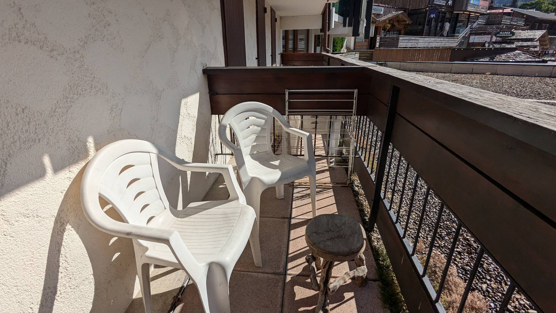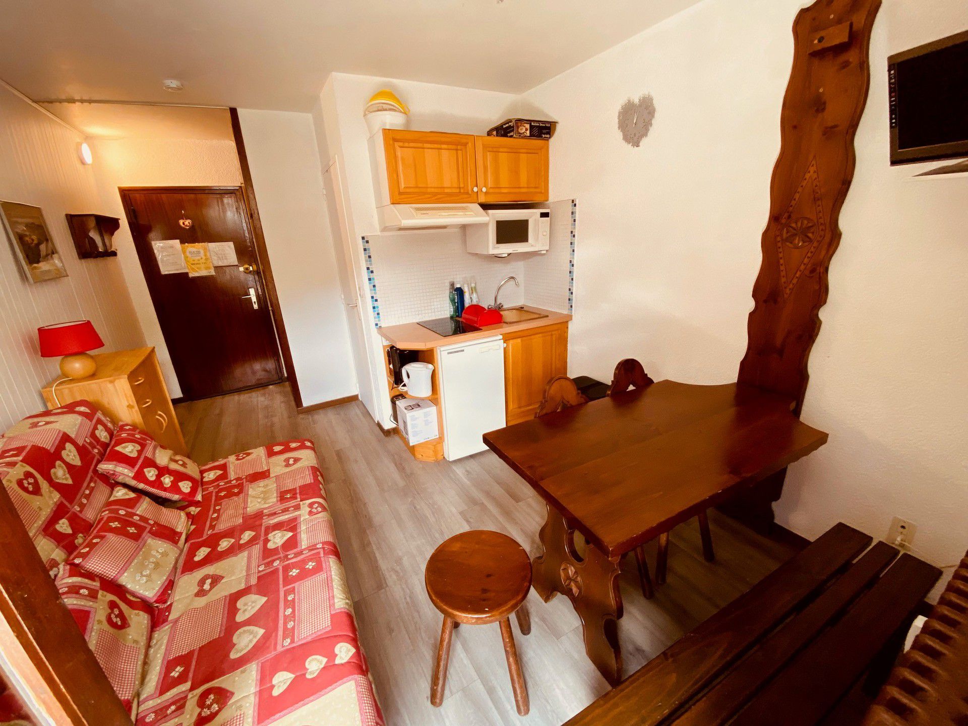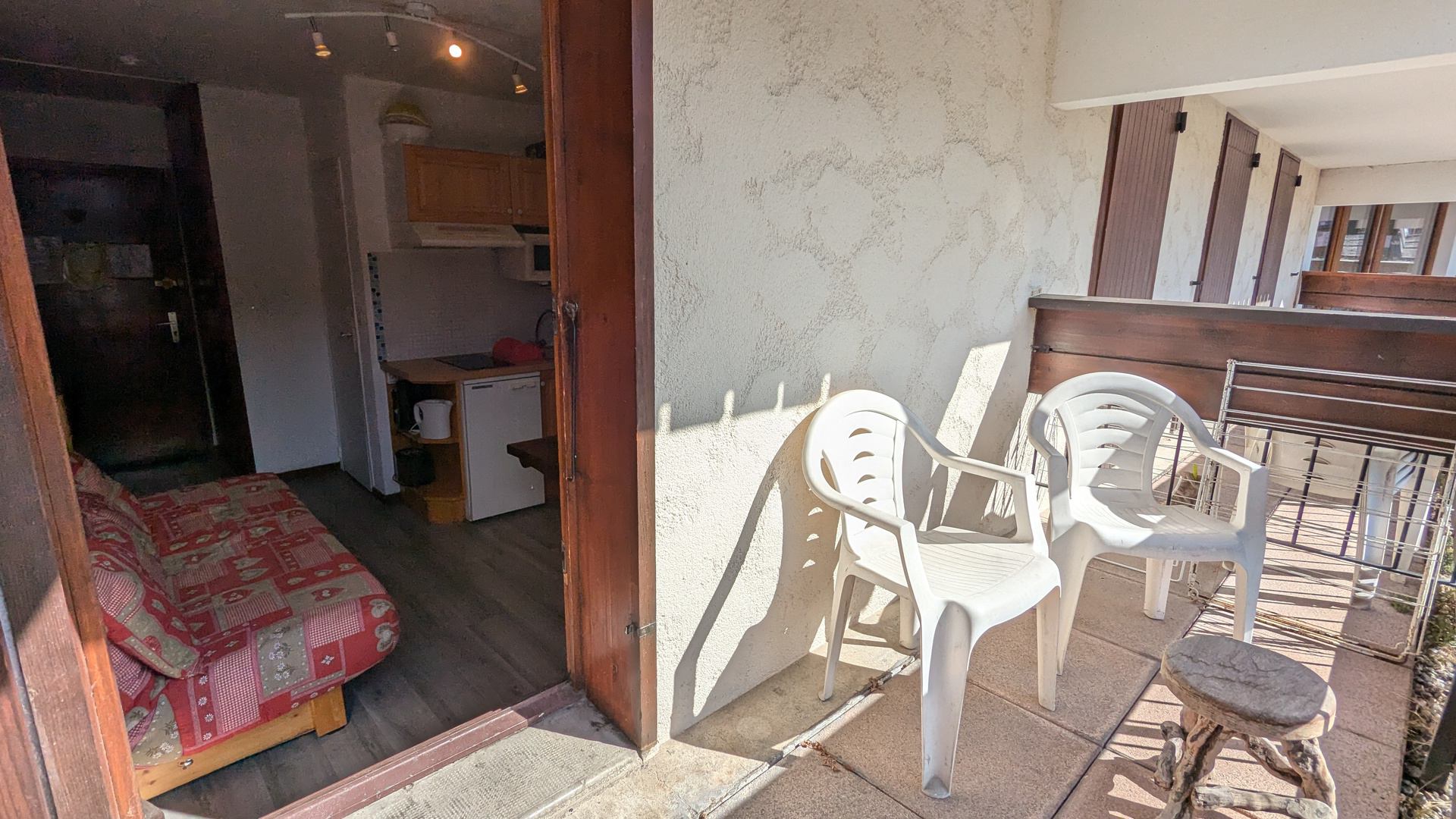Entree : placard - Salle d'eau : douche, lavabo, miroir, WC - Sejour (10 m2) avec coin salon : canape, petite television, porte fenetre acces balcon (1 marche) sud vue village et pistes - Coin repas : table, banc et chaises - Coin cuisine: plaques vitroceramiques 2 feux, hotte, micro-onde, refrigerateur (125L), placards, cafetiere electrique a filtre, bouilloire, grille-pain, appareil a raclette. Blacon avec 2 chaises et une petite table d'appoint.