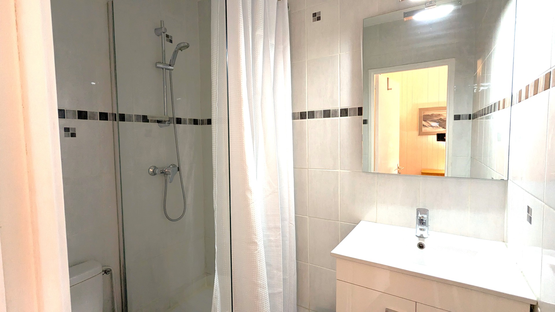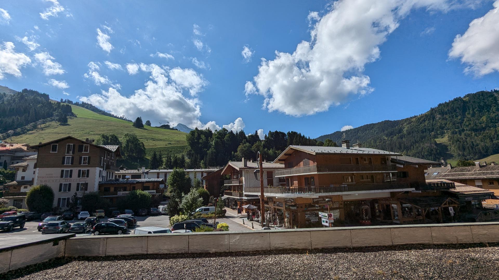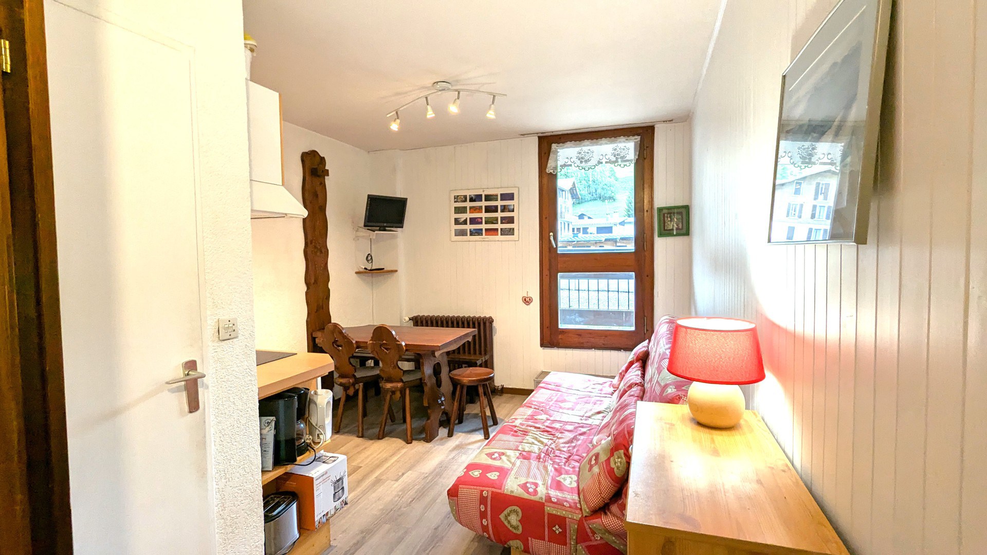 Entree : placard - Salle d'eau : douche, lavabo, miroir, WC - Sejour (10 m2) avec coin salon : canape, petite television, porte fenetre acces balcon (1 marche) sud vue village et pistes - Coin repas : table, banc et chaises - Coin cuisine: plaques vitroceramiques 2 feux, hotte, micro-onde, refrigerateur (125L), placards, cafetiere electrique a filtre, bouilloire, grille-pain, appareil a raclette. Blacon avec 2 chaises et une petite table d'appoint.
