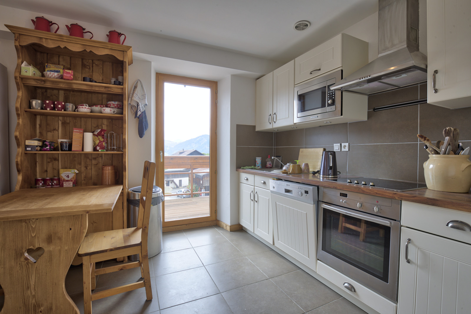 - Cuisine toute équipée avec plaques vitrocéramiques, four, micro-ondes, lave vaisselle, réfrigérateur, petit congélateur