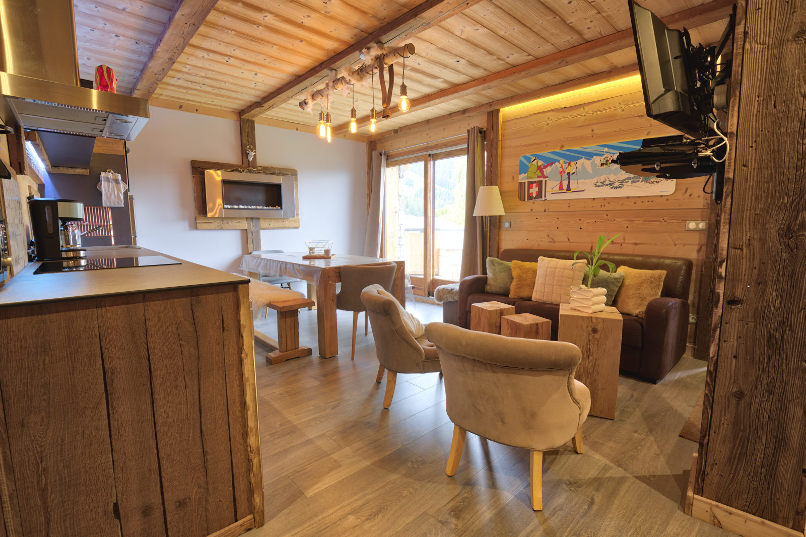 Tres bel appartement de 78m2 dans un style montagnard et moderne, compose de cinq pieces, ideal pour six a huit personnes. En rez de jardin vous apprecierez sa grande terrasse SUD/OUEST, tables de jardin et chaises avec vue sur le Mont Charvin, Mont Bisanne et la Chaine des ARAVIS.