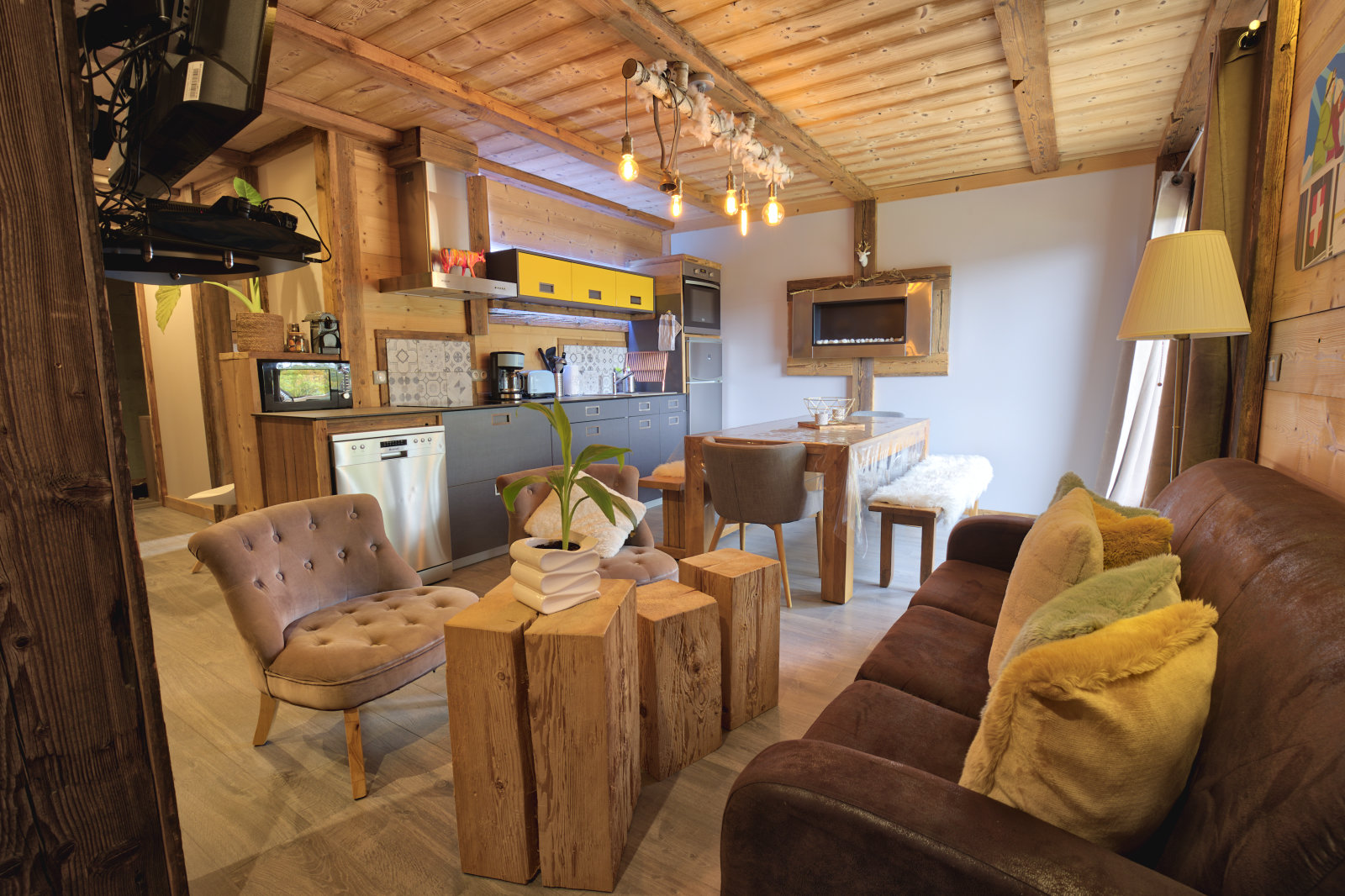 - Piece a vivre avec cuisine ouverte toute equipee (plaque electrique, hotte, refrigerateur avec case congelation, four, micro-onde, lave-vaisselle), cheminee a l'ethanol, televiseur ecran plat et play station.