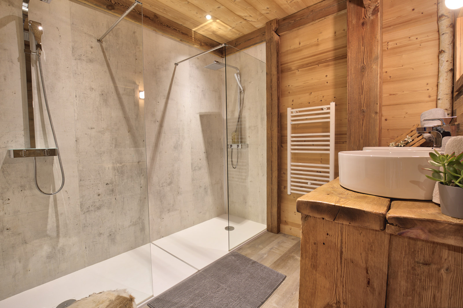 - Salle de douche avec double douches et double vasque.