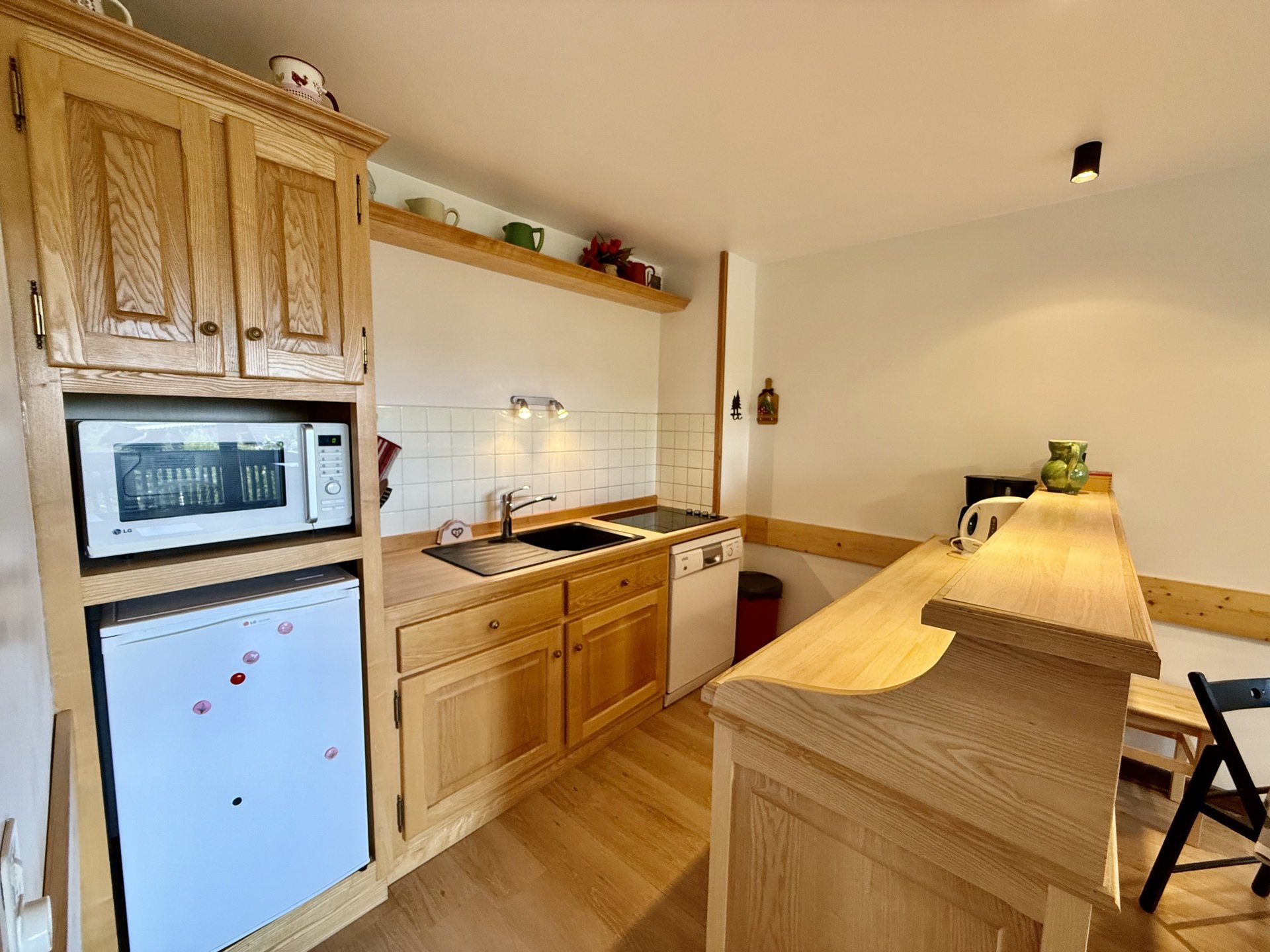 - Cuisine ouverte sur sejour avec mini bar de separation : quatre plaques vitroceramiques, lave vaisselle, micro-ondes, refrigerateur.