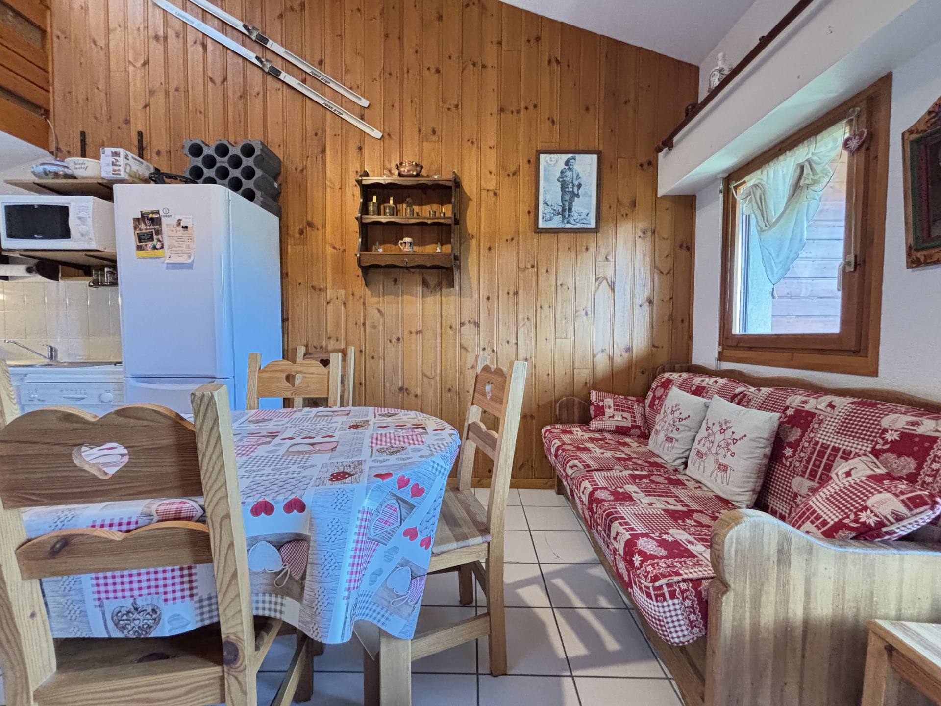 Chaleureux duplex de 42m2 + 12.5m2<1.80m au premier etage de cette residence calme, avec balcon Sud offrant une jolie vue sur le Mont Charvin et la vallee.