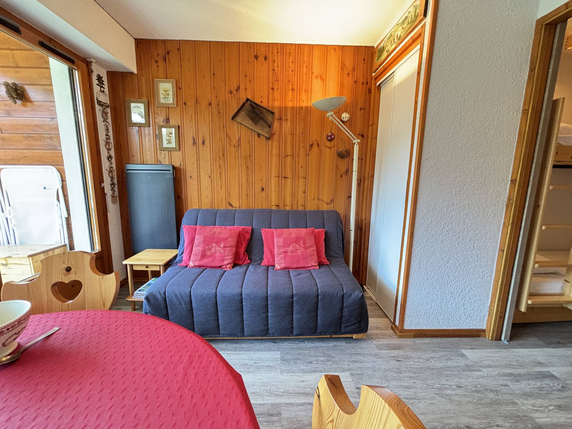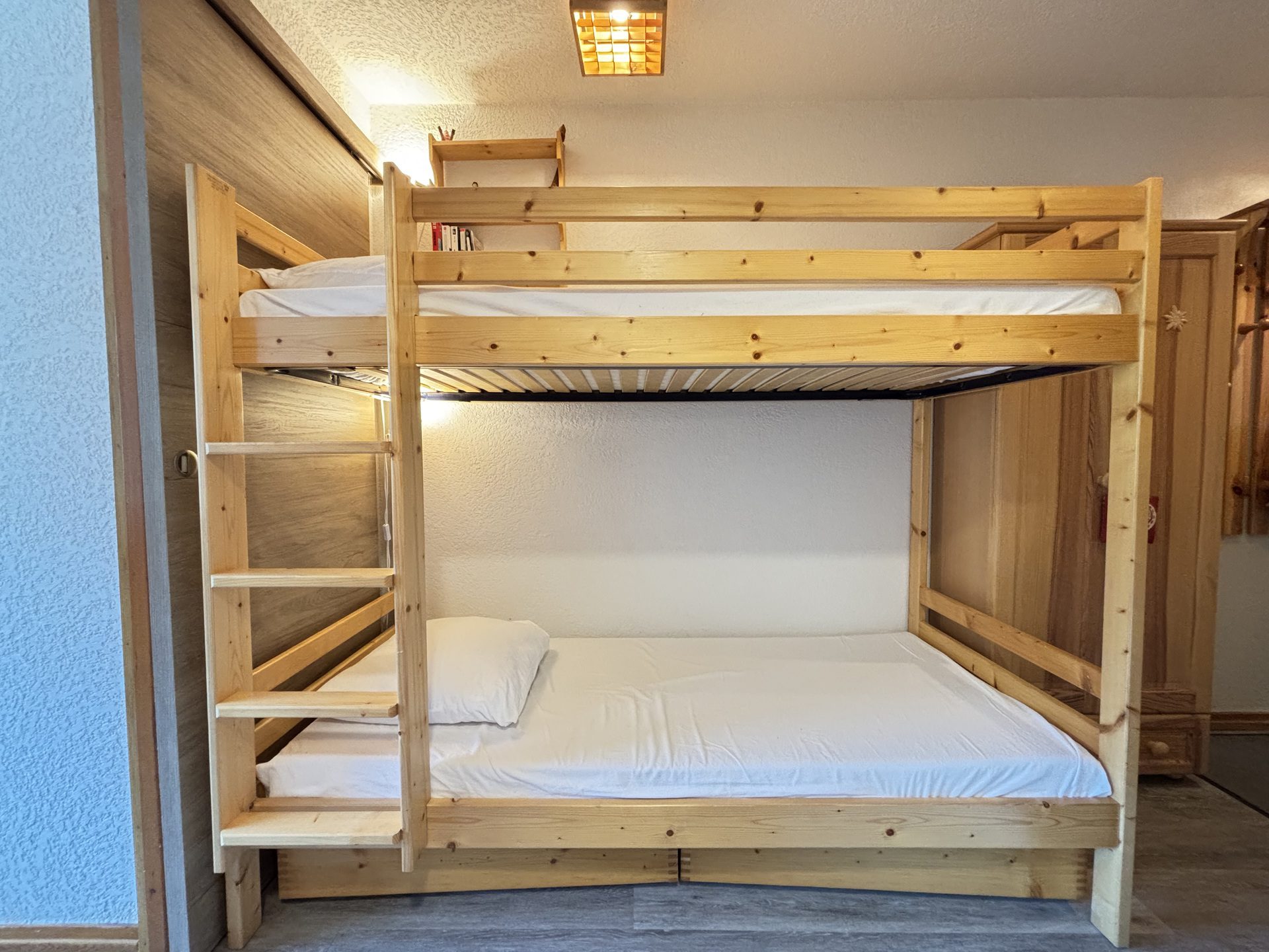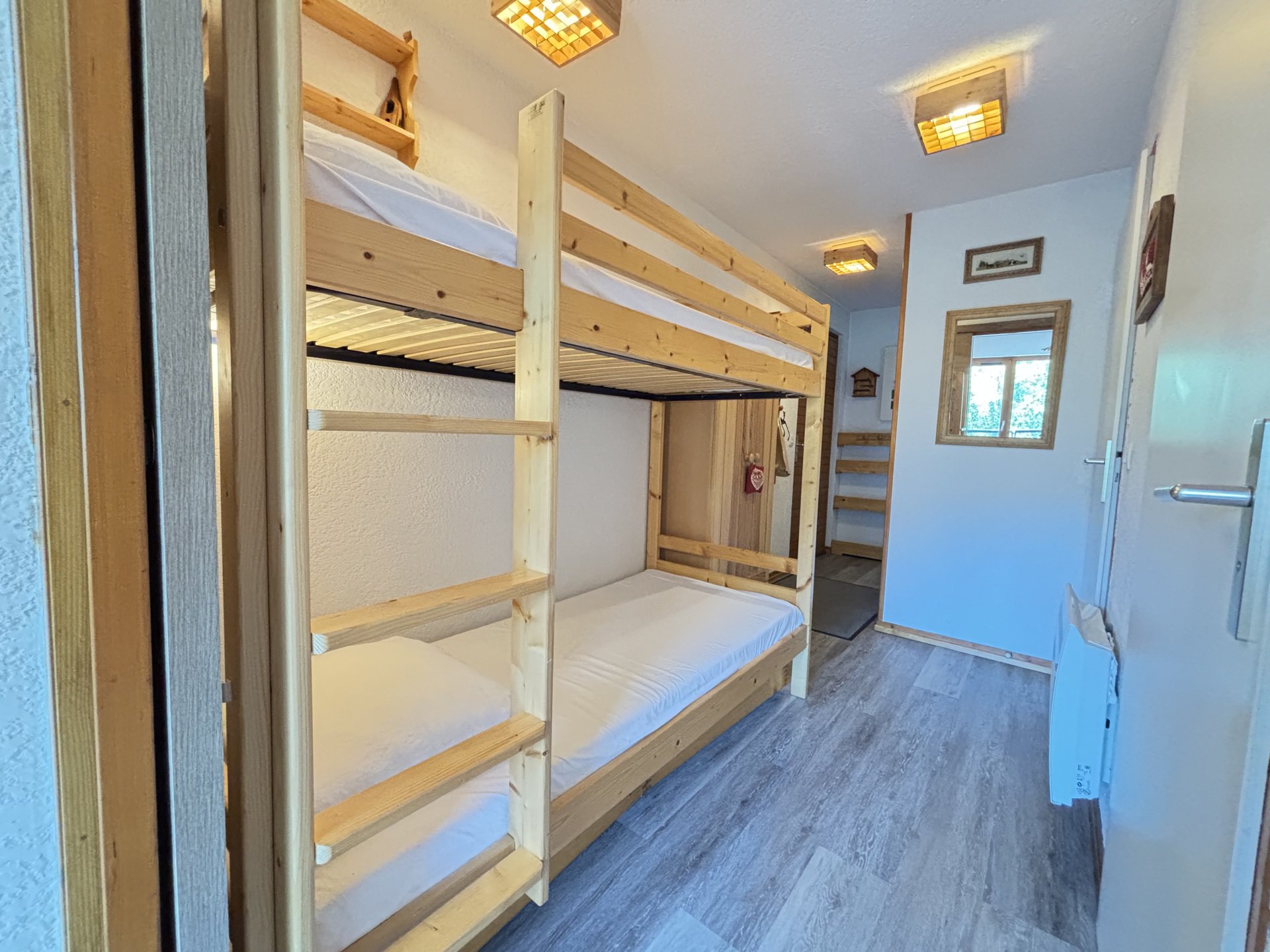 - Couchages : une chambre avec un lit double (1x140), coin montagne avec lits superposes une place (2x90), sejour avec un canape-lit (140). Literie equipee de couettes.