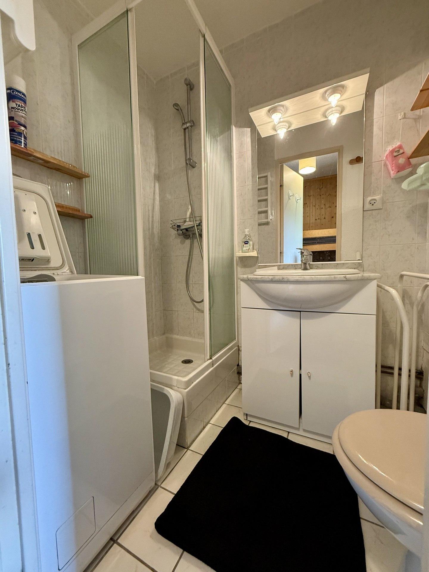 Une salle d'eau avec douche, meuble vasque, toilette et machine a laver