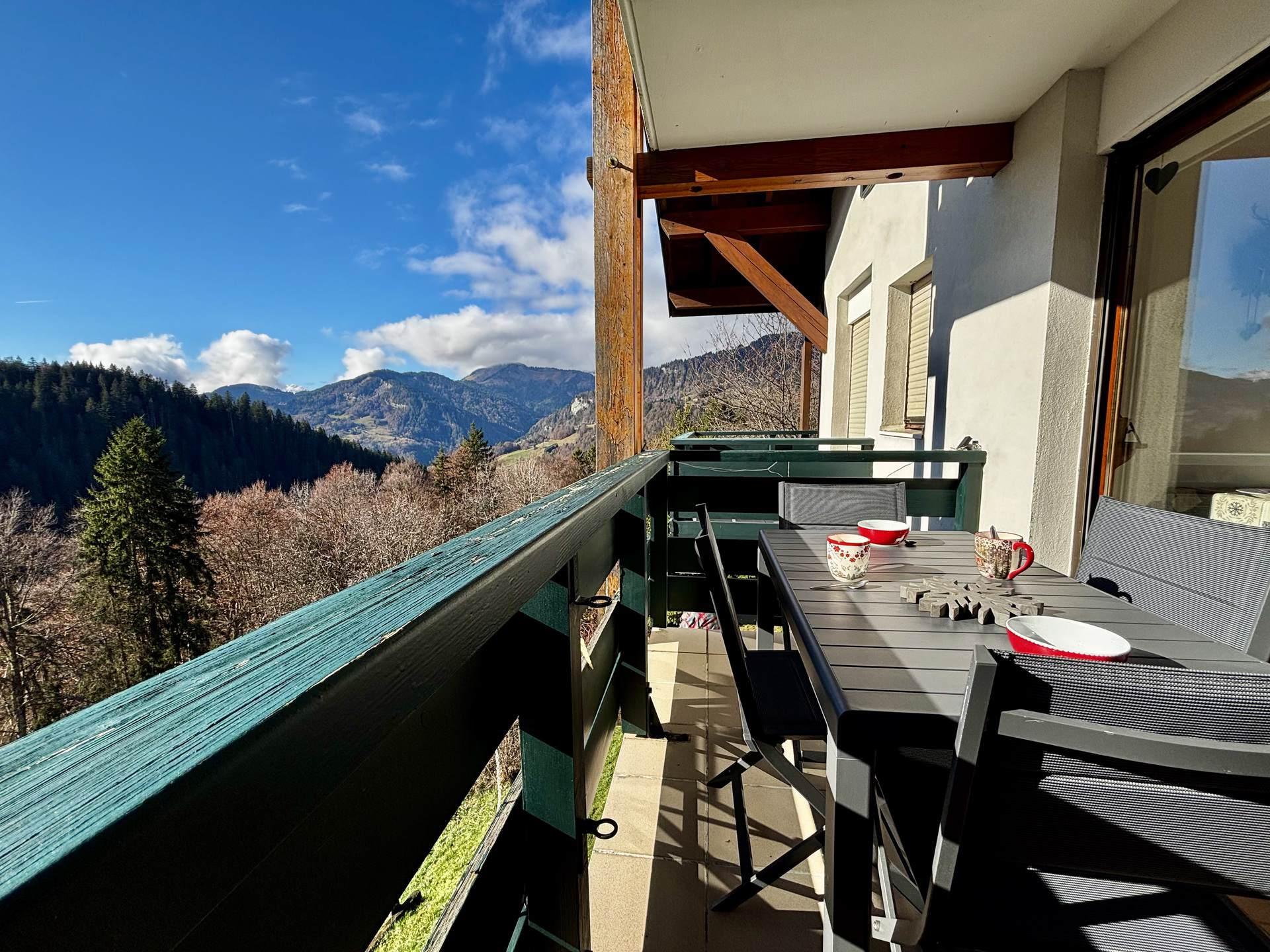 Appartement cosy et chaleureux d'environ 42 m2, ideal pour accueillir confortablement 4 a 6 personnes. Situe au 1er etage, il dispose d'une terrasse exposee Sud offrant une vue degagee sur la foret et les montagnes.