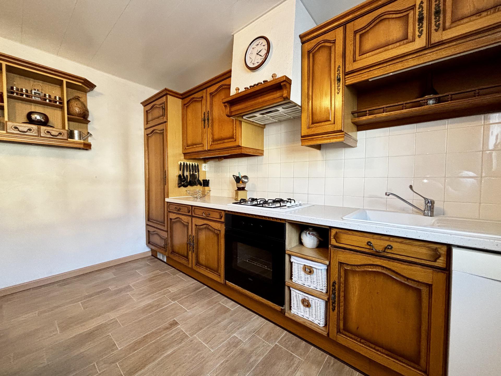 Une cuisine separee avec coin salle a manger : refrigerateur avec compartiment congelation, micro-ondes, four, plaque au gaz bouteille et lave-vaisselle