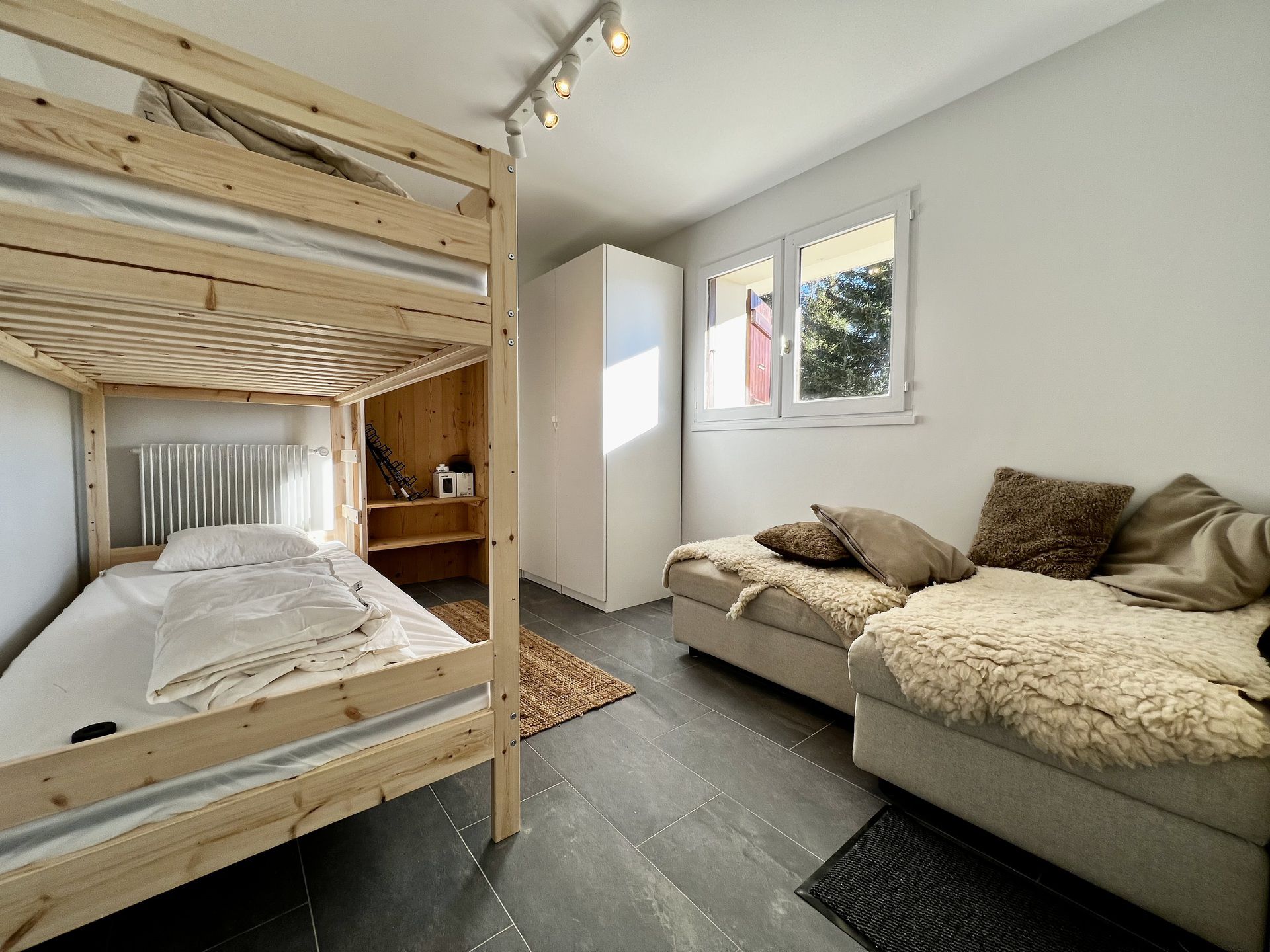 *Au REZ DE CHAUSSEE : un garage, un ski-room et local velos, une chambre double (lit de 160), une chambre avec lits superposes (2*90), une salle de douches et toilettes, une machine a laver.