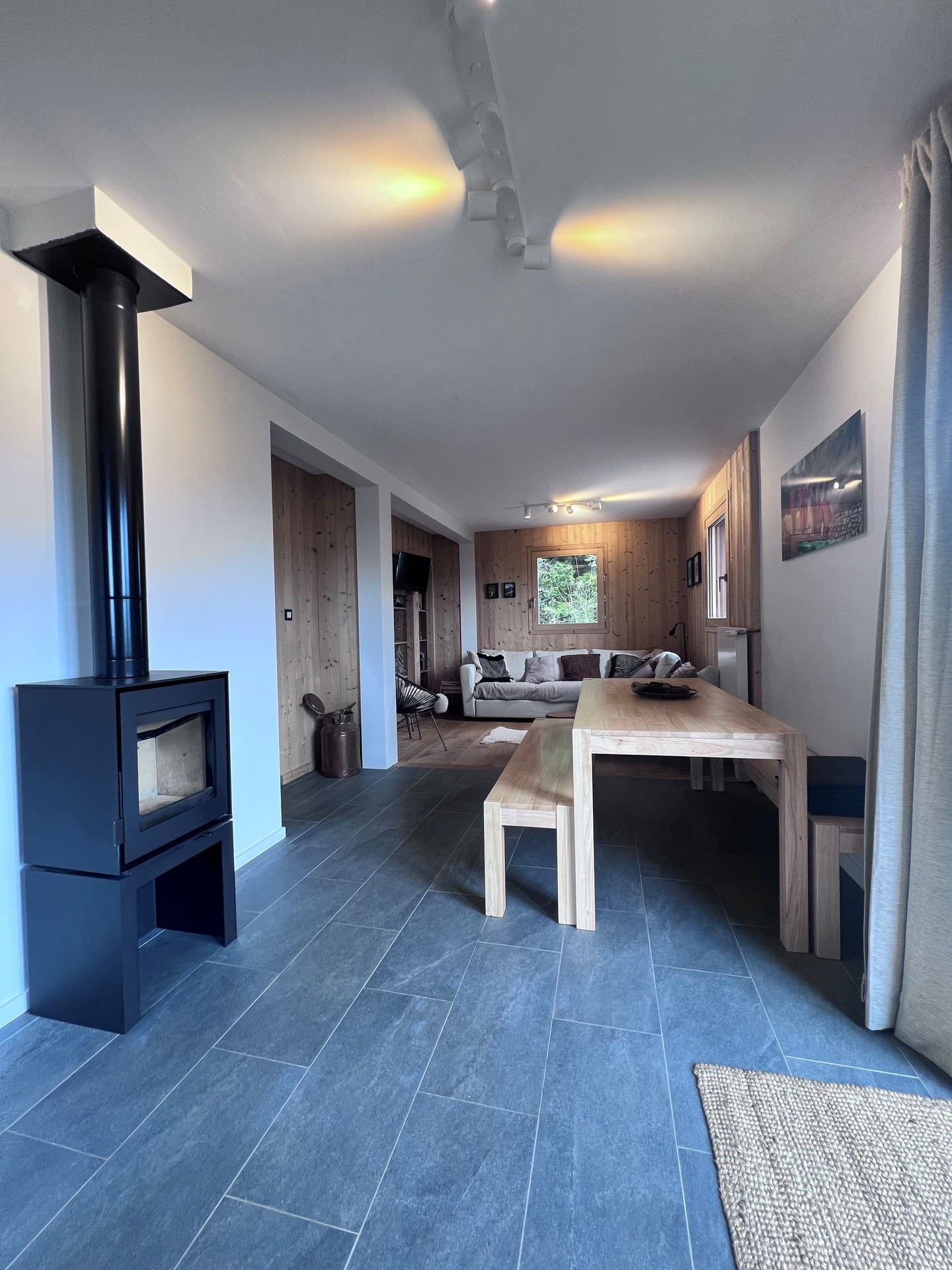 *A L'ETAGE : une spacieuse et lumineuse piece a vivre avec poele a bois, une cuisine ouverte equipee (plaque electrique, hotte, refrigerateur avec case congelation, four, micro-onde, lave-vaisselle), le tout ouvert sur le balcon et la grande terrasse (plancha disponible en periode estivale).