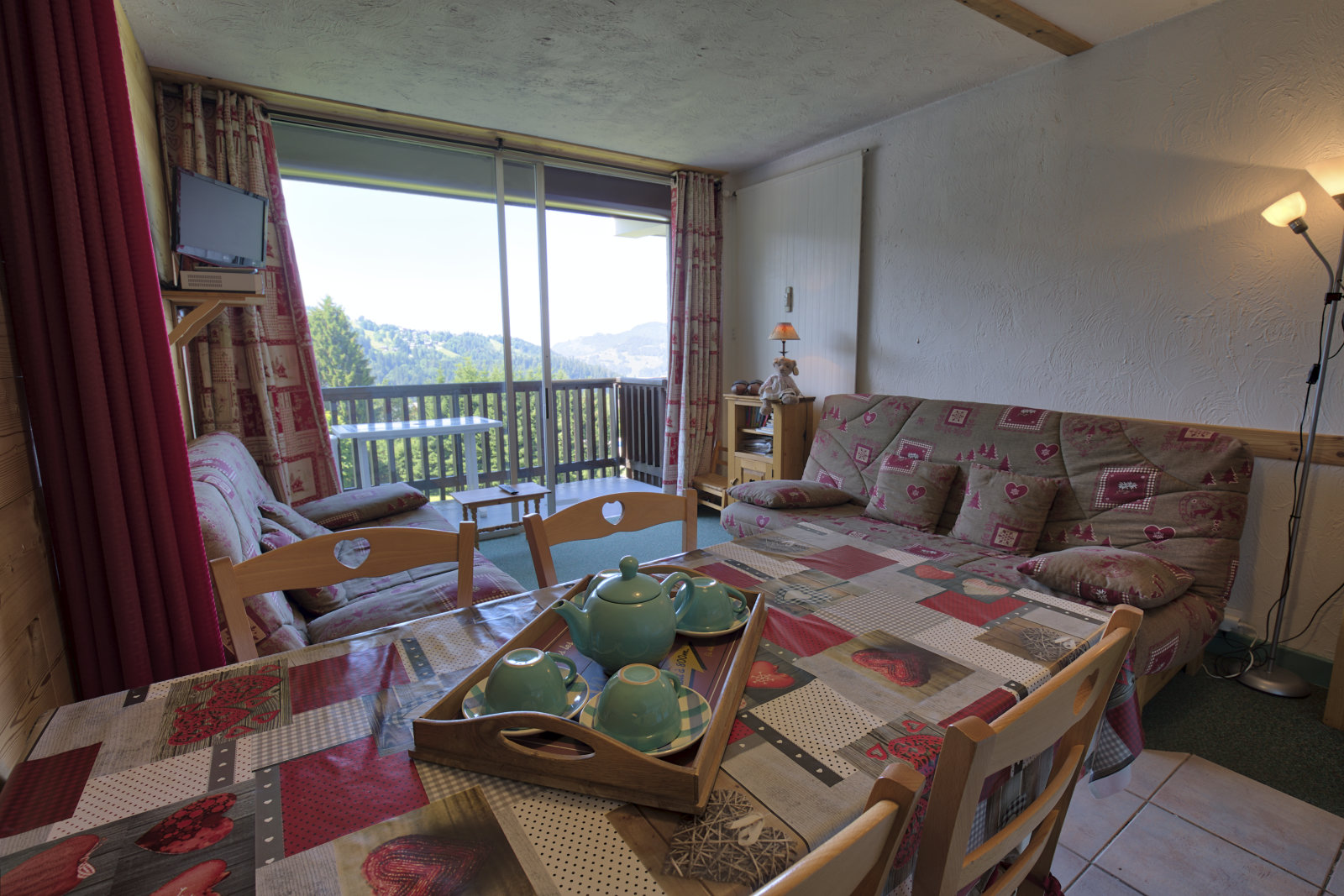Studio pour quatre personnes situe dans la residence des Alpages, skis aux pieds. Situe au 5eme etage, d'une surface de 26m2, vous apprecierez son agreable balcon SUD avec vue degagee sur le village, le Mont Charvin et la vallee.