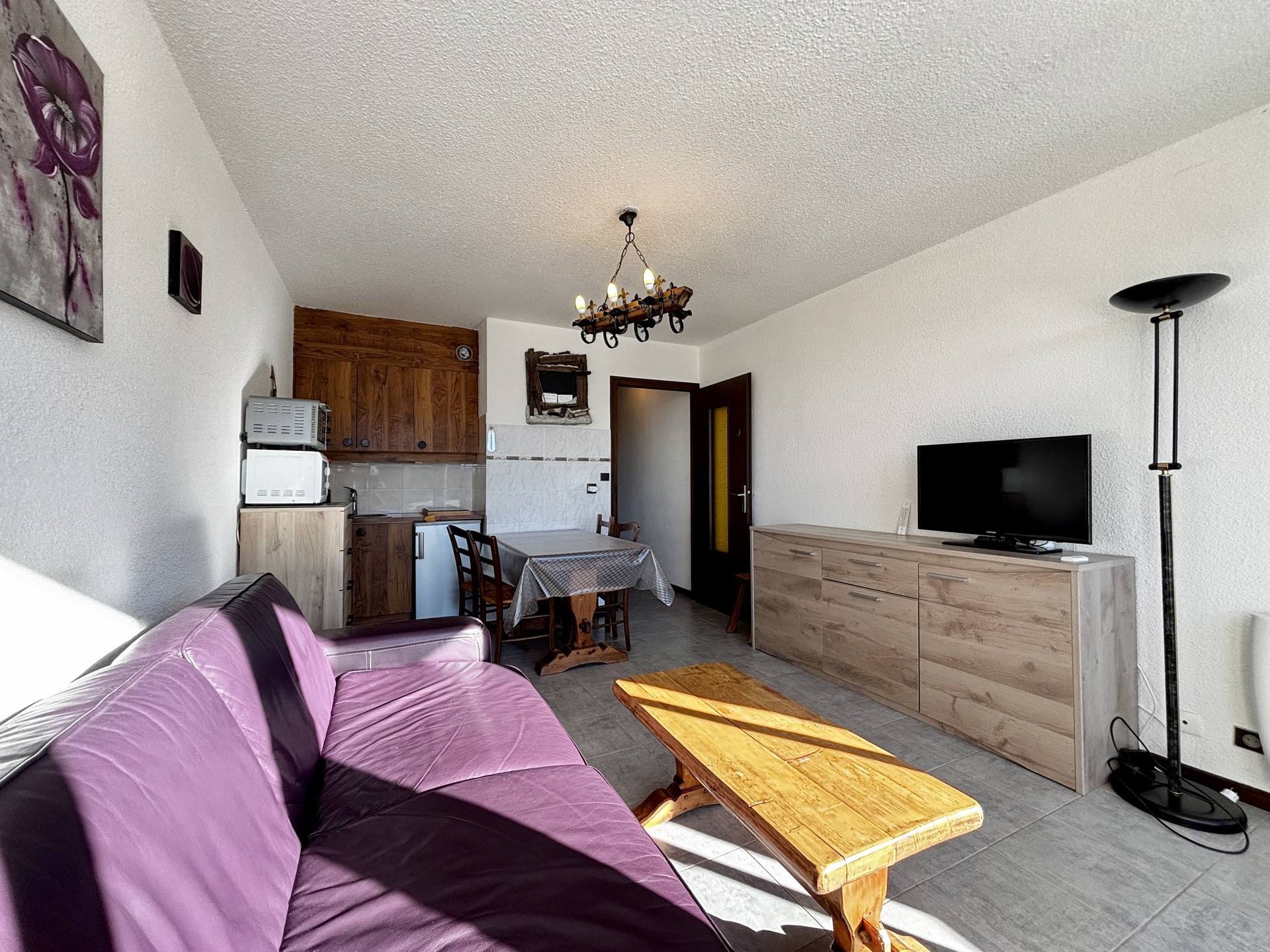 Ce studio de 25,04 m2, situe au 6e etage, beneficie d'une vue imprenable sur le village, la piscine et le Mont Charvin. Son balcon expose plein Sud permet de profiter du soleil tout au long de la journee. Concu pour accueillir jusqu'a quatre personnes, il constitue un hebergement confortableet agreable.