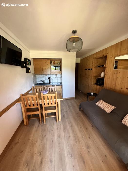 Wc indépendant, salle d’eau avec douche, pièce à vivre avec cuisine ouverte, grand balcon vue piste.