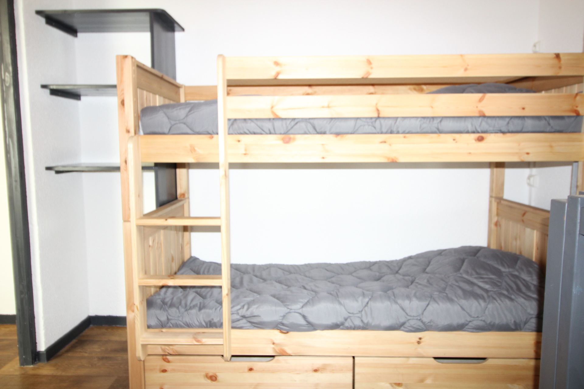 Un coin montagne sur la mezzaznine : 2 lits superposés 2 x 1 place + étagères