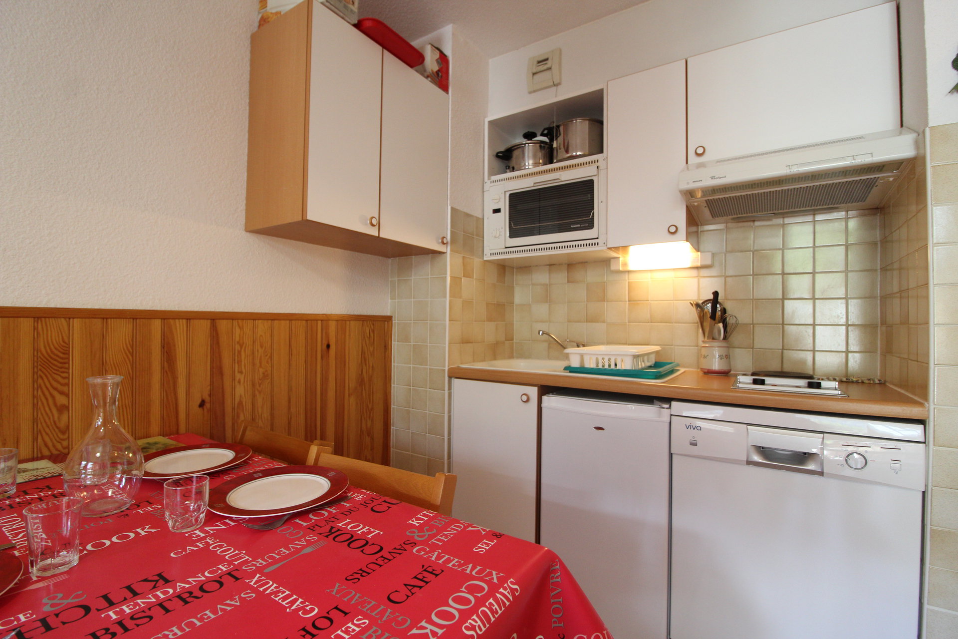 Kitchenette equipee : 2 plaques induction, four, refrigerateur, lave vaisselle.