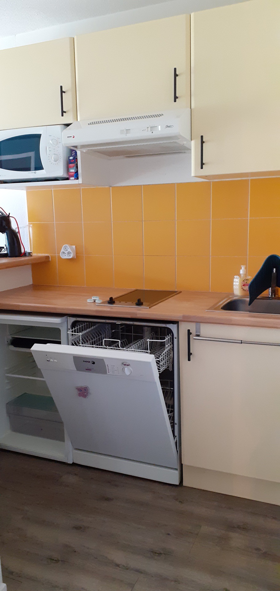 Coin cuisine équipée d'une plaque vitro céramique, micro-ondes, lave-vaisselle, réfrigérateur, cafetière Dolce gusto