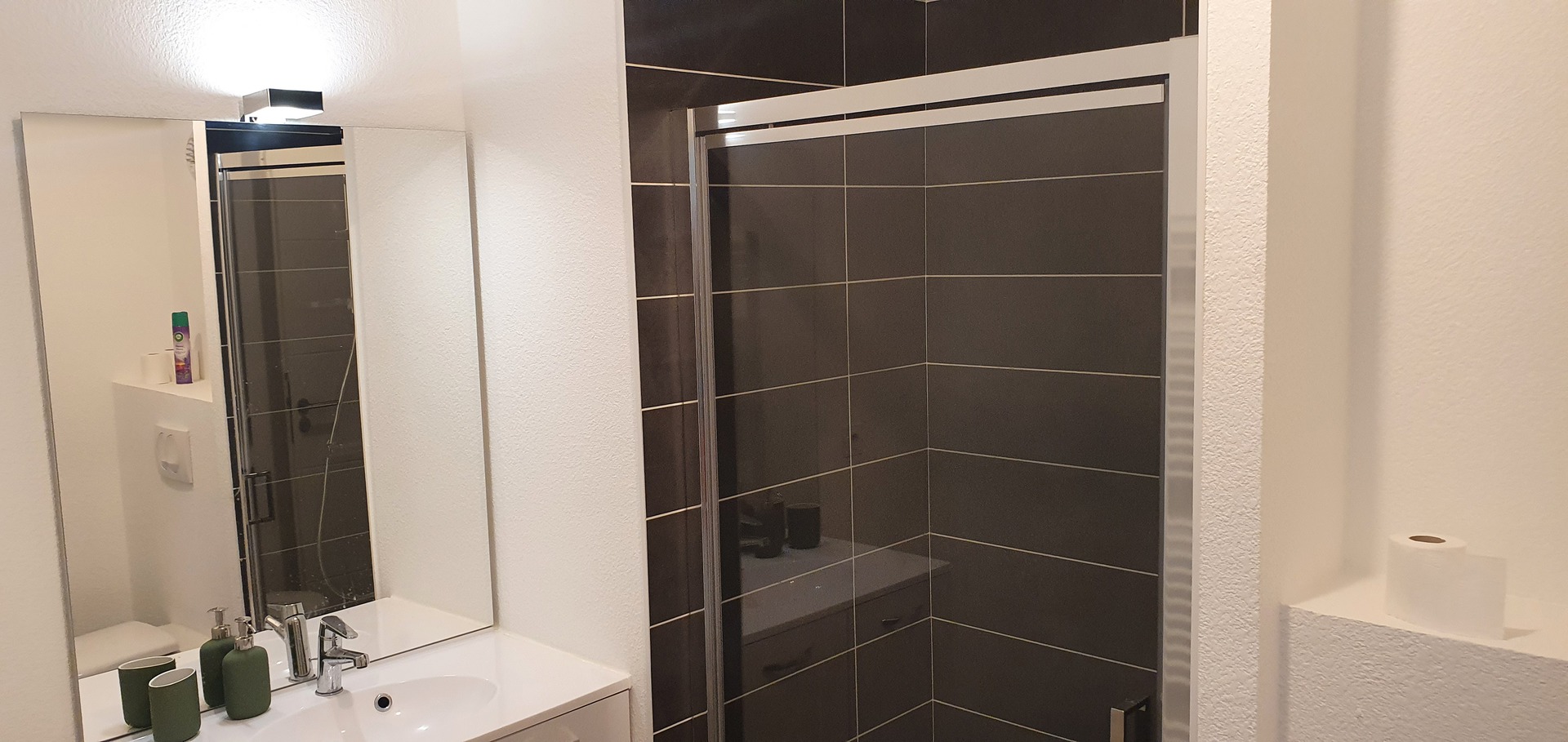 Entrée: placards intégrés, meuble chaussures – WC - Salle de bains – lave-linge 8kg (6k séchage). Cuisine équipée ouverte sur le séjour : lave-vaisselle, four, micro-ondes, réfrigérateur, congélateur, 3 plaques vitrocéramiques, grille-pain, bouilloire, Nespresso, appareil à raclette et fondue, mixeur. Séjour: table, chaises, canapé, TV, table basse, baies vitrées accès terrasse (37m²), mobilier de jardin, vue sur espaces vert - Chambre 1 (12.87 m²): 1 lit 160x200cm, porte fenêtre accès terrasse, placard intégré. Chambre 2 (10.50m²): 1 lit 140x200cm, fenêtre, placard intégré. Chambre 3 (18.87 m²): 4 lits superposés (2x2), fenêtre, salle de douche, WC. Garage n°7 (H:2m, l:2.36m)- Casier à ski n°BC03 - Couettes - Chauffage électrique avec thermostat - WiFi - Arrêt ski-bus à proximité - Animaux non autorisés - Accès à un garage à vélos au niveau du bâtiment - Classement : *** pour 8 personnes